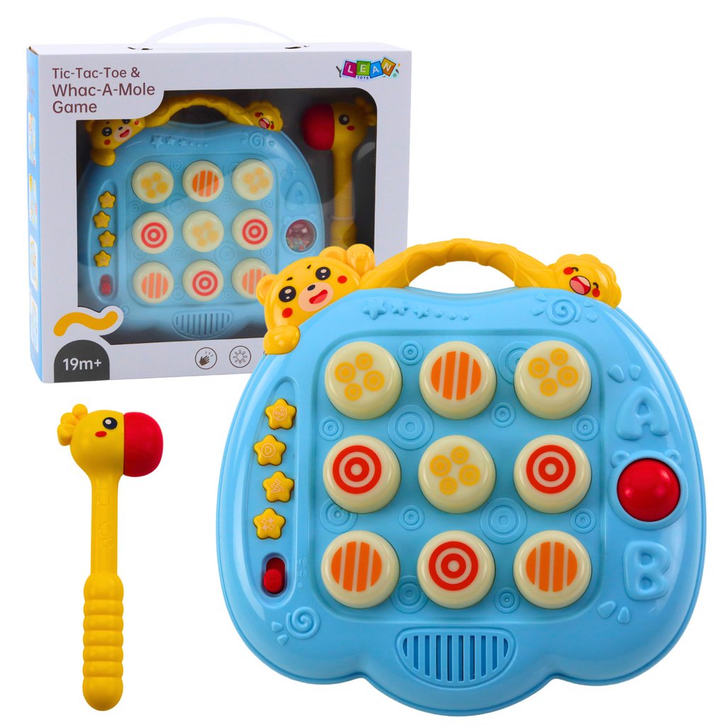 Interaktivní dovednostní hra Whac-A-Mole pro batolata, modrá je poutavou zábavou, která rozvíjí reflexy, koordinaci ruka-oko a soustředění u dětí Princip hry spočívá v úderu kladívkem na světelné klávesy, které se náhodně rozsvěcují na herní desce