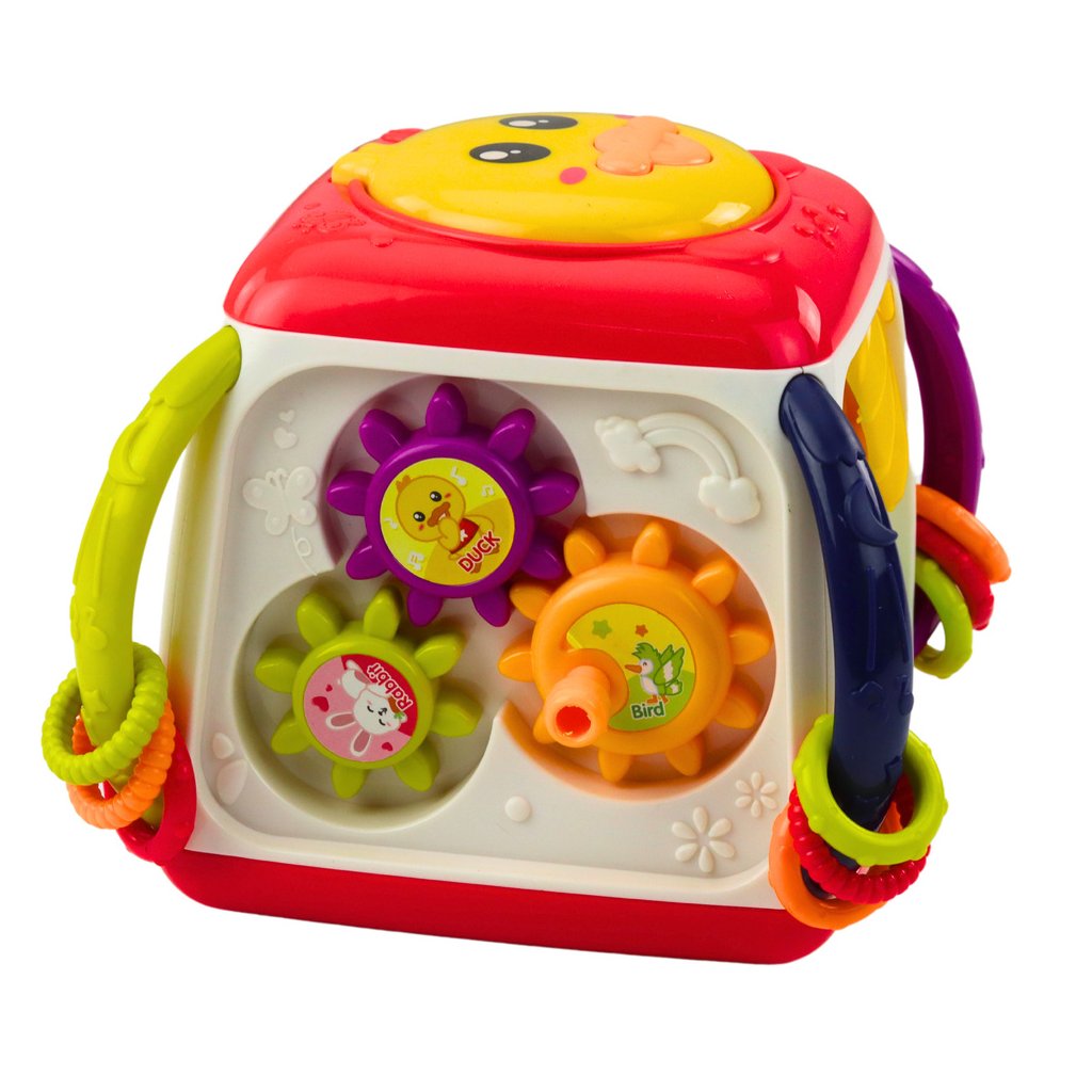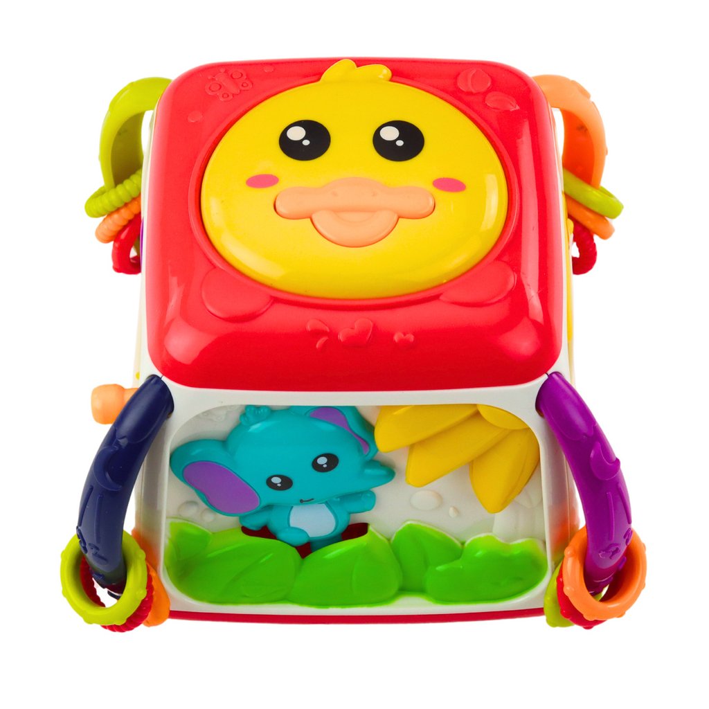 Kostka obsahuje hudební tlačítka, rotační ozubená kolečka, posuvné prvky, veselé grafiky zvířátek a barevné boční úchyty Na jedné ze stěn je milý lev s hudebním panelem, který povzbuzuje dítě k interakci