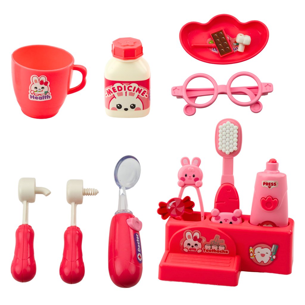 Sada obsahuje realistické stomatologické doplňky, jako je zubní kartáček, zrcátko, vrtačka, injekční stříkačka, kelímek a lahvička s „léčivem“. Děti si tak mohou procvičovat každodenní hygienické návyky, jako je čištění zubů, a simulovat ošetření, vrtání, ba dokonce odstraňování „nemocných“ zubů.