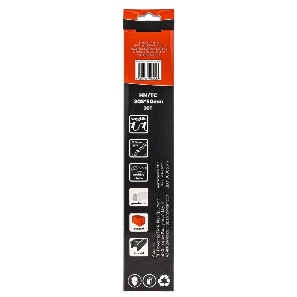 Odolný karbidový plátek (HM/TC) Powermat PM-BDP-305T pro šavlové pily. Díky délce 305 mm zvládne i hlubší řezy a jemnější ozubení 20 TPI podporuje rychlý a stabilní řez ve stavebních materiálech. Univerzální upnutí pasuje na většinu šavlových pil.