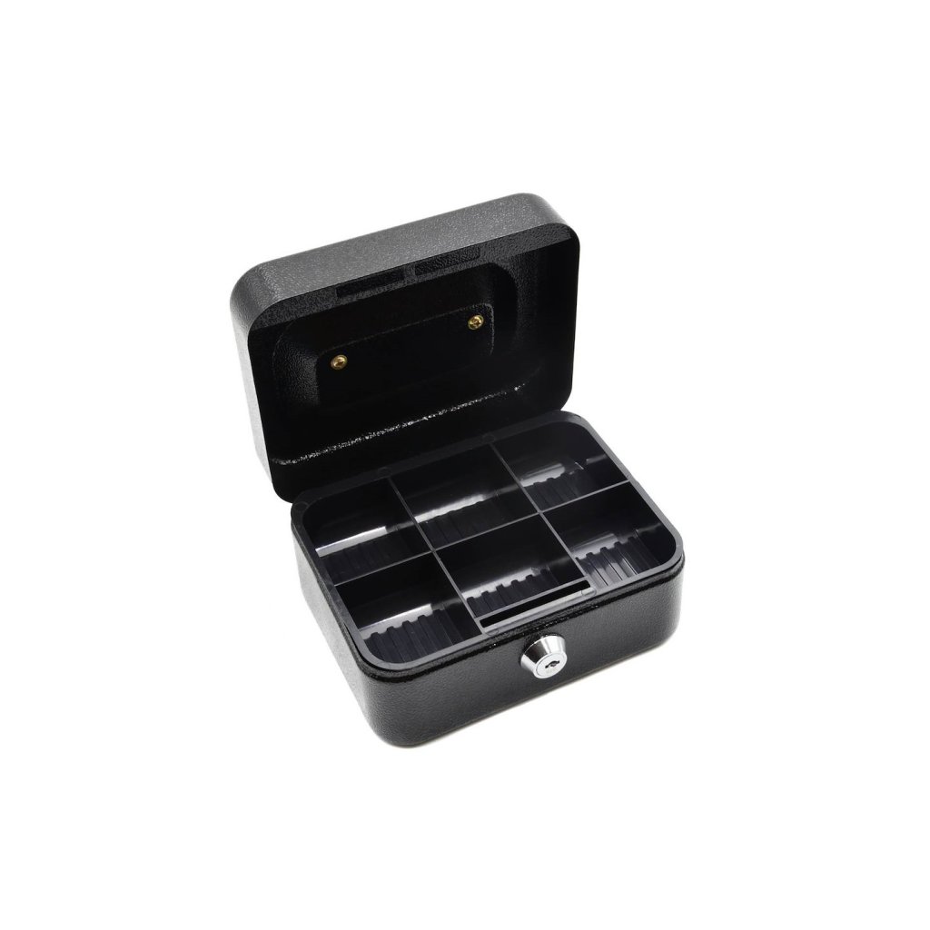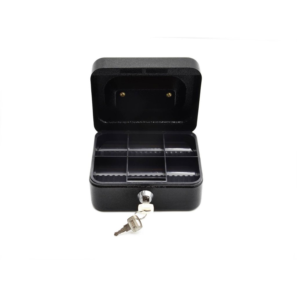 Kovová pokladnička na peníze. Uzavíratelná na klíč (2 ks v sadě). Vybavena držadlem pro přenášení. Uvnitř plastová vložka s přihrádkami: