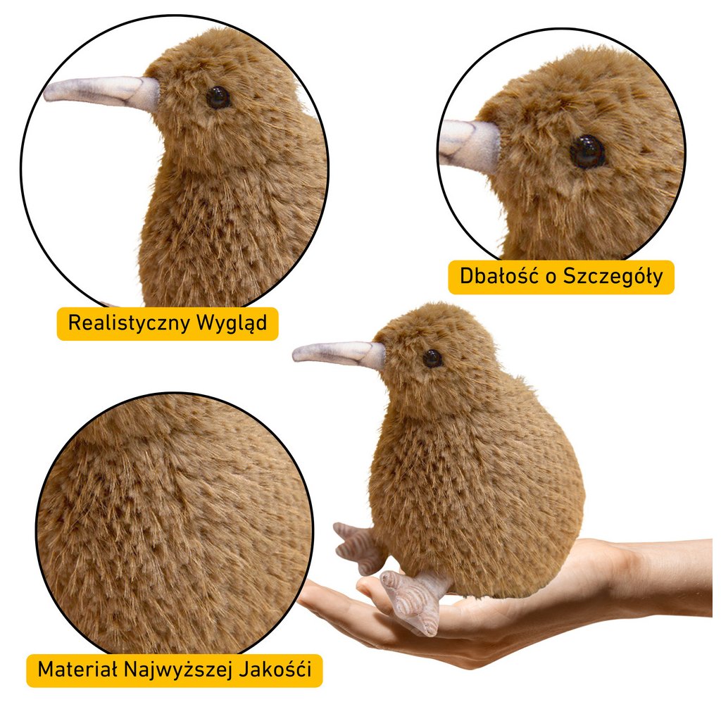- Tento světlehnědý společník o výšce 21 cm věrně napodobuje charakteristické opeření kiwiho ptáka a jeho detaily jsou tak přesné, že vás přenesou přímo do srdce divočiny