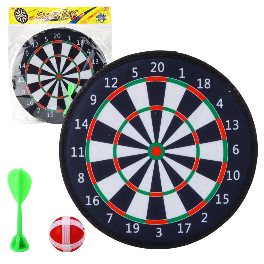 je lehké, měkké a plně bezpečné Sada obsahuje černou terč o průměru 28 cm, jednu šipku a jeden míček, oboje zakončené suchým zipem