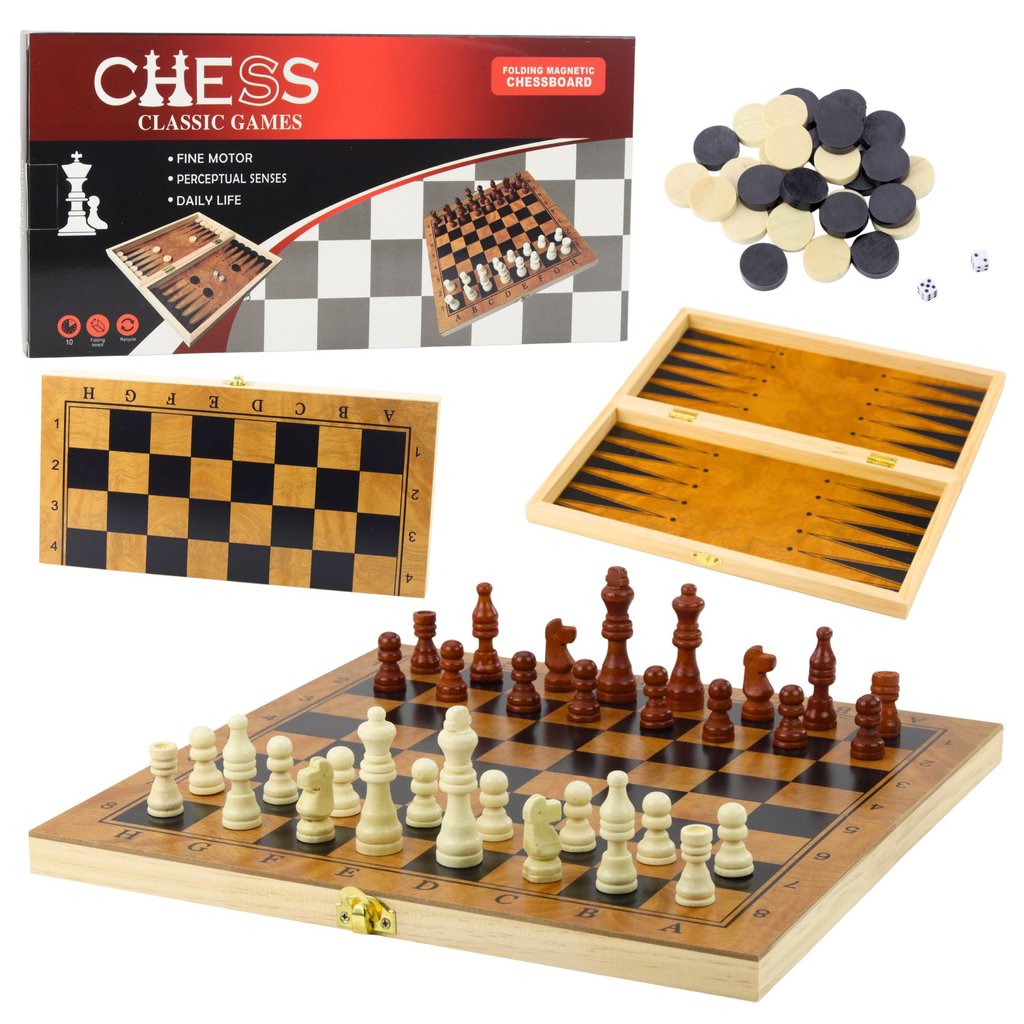 Klasické Dřevěné Stolní Hry 3v1: Šachy, Dáma, Backgammon