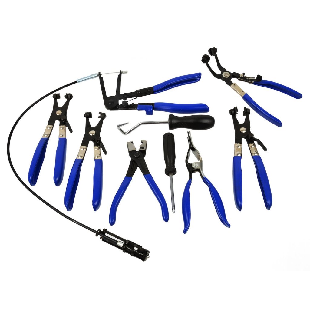 Bohatá sada kleští umožňuje montáž a demontáž páskových svorek, svorek kloubových krytů, svorek typu click a click-r, a kleště na demontáž palivových hadic, podtlakových hadic atd.