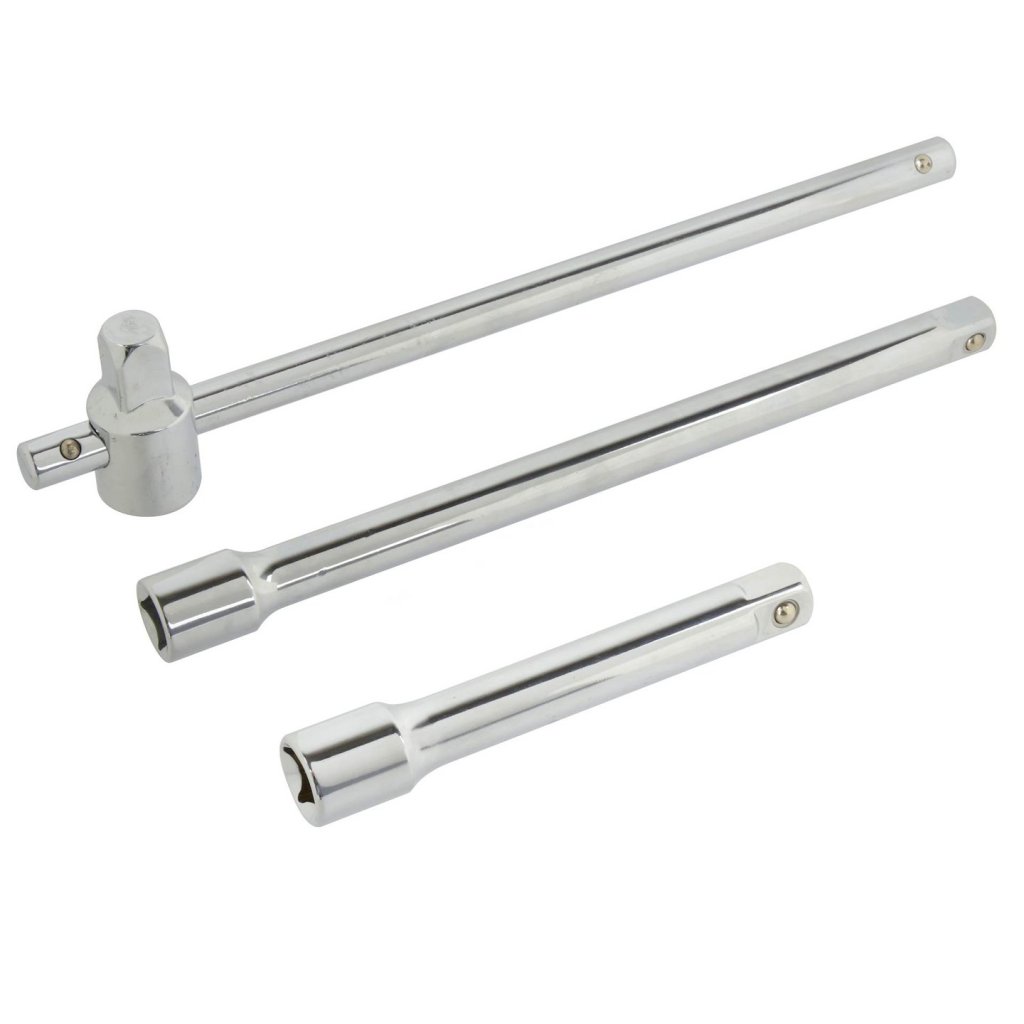 Klíč typu „T“ v sadě s prodlouženími o délce 250 mm a 120 mm. Sada je vyrobena z vysoce kvalitní nástrojové oceli CrV. Má zásuvku a čep pro nástrčné klíče velikosti 1/2”.