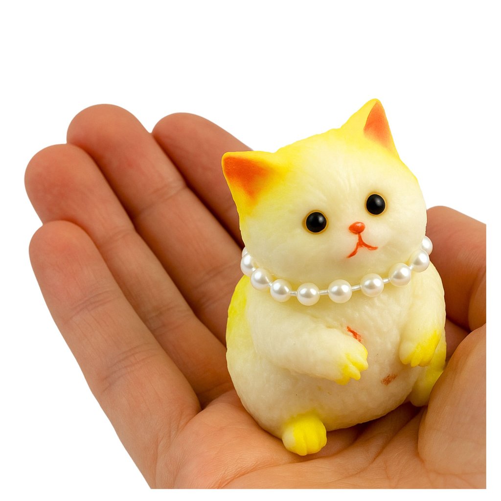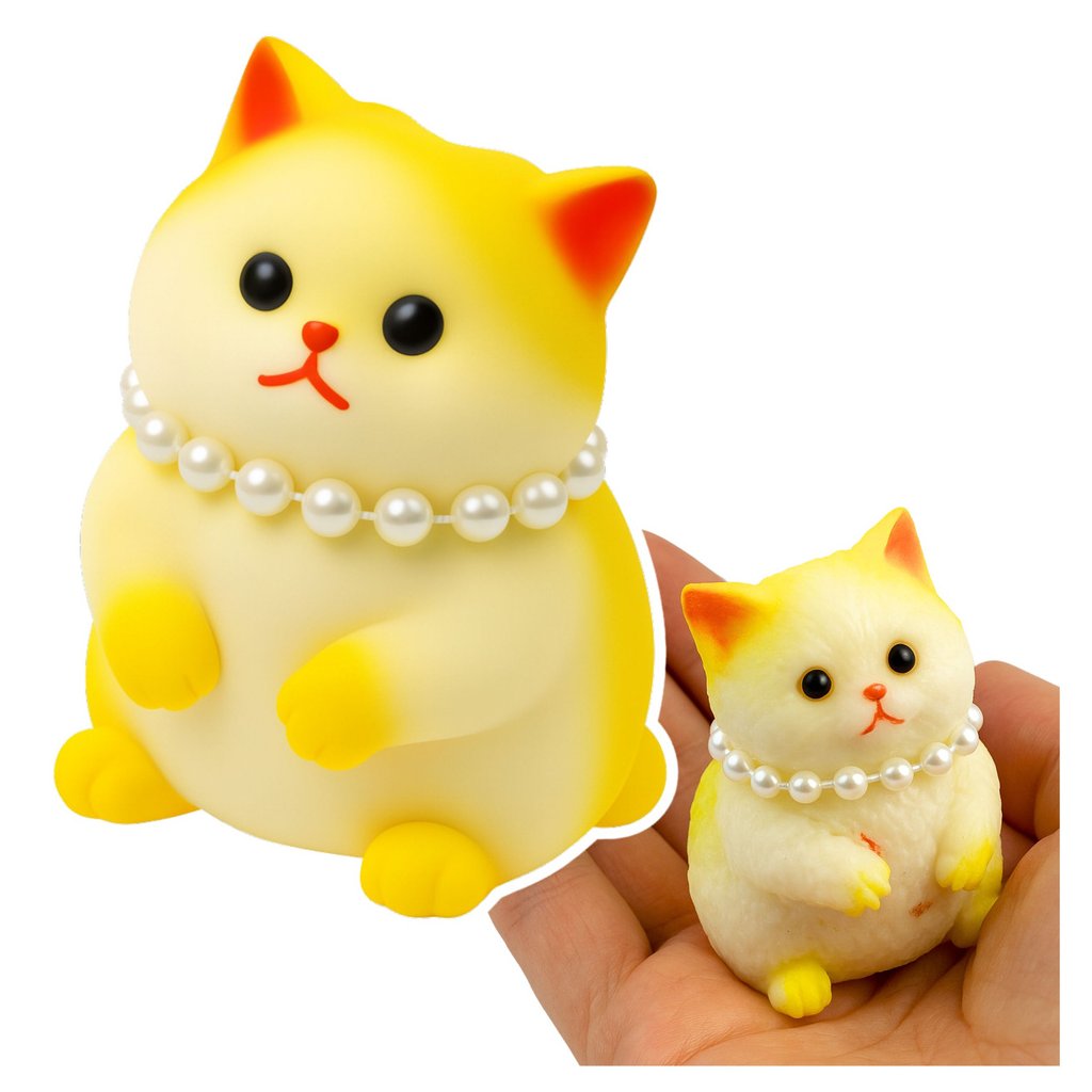 Tento žlutobílý kotek je ozdoben perlovým náhrdelníkem, což mu dodává půvabný a elegantní vzhled. Je ideální k zmáčknutí a stlačení, což pomáhá uvolnit emoce, relaxovat a zlepšovat náladu. Hodí se pro dospělé i děti a je skvělým společníkem při stresových chvílích nebo nudě.