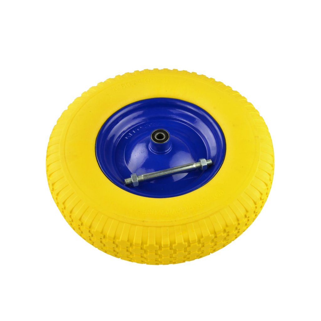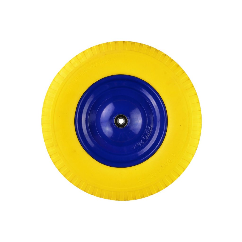 Bezdušové kolo pro kolečko 4,00-8. Je vyrobeno z odolného polyuretanového materiálu. Zesílený kovový ráfek, lakovaný práškovou barvou, zajišťuje zvýšenou stabilitu. Celek je vyroben z vysoce kvalitních materiálů.
