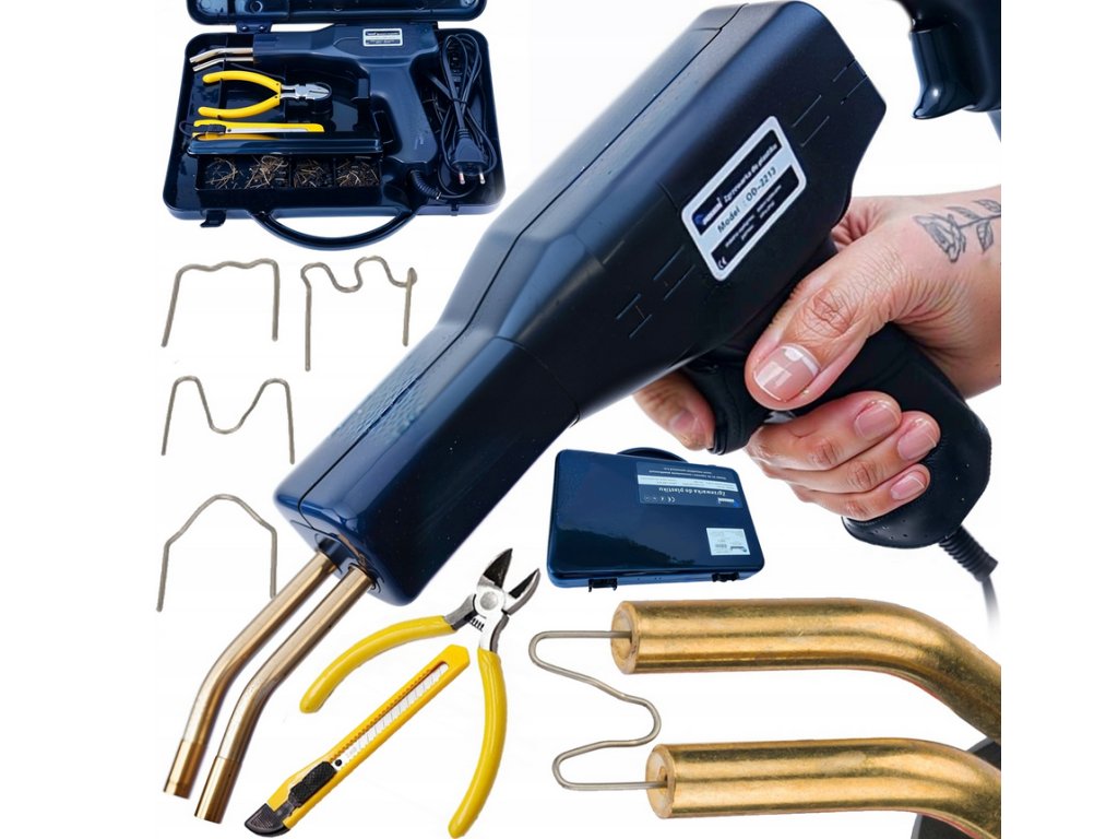 - Sešívačka na plast: Speciální nástroj pro svařování plastových částí pomocí kovových hřebíků, které se zapustí do materiálu a vytvoří pevný spoj.