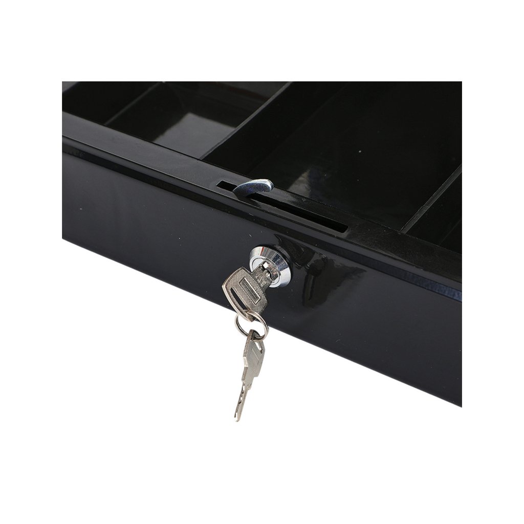 Kovová dvouúrovňová pokladnička na peníze s přepážkami, 2 klíčky, černá