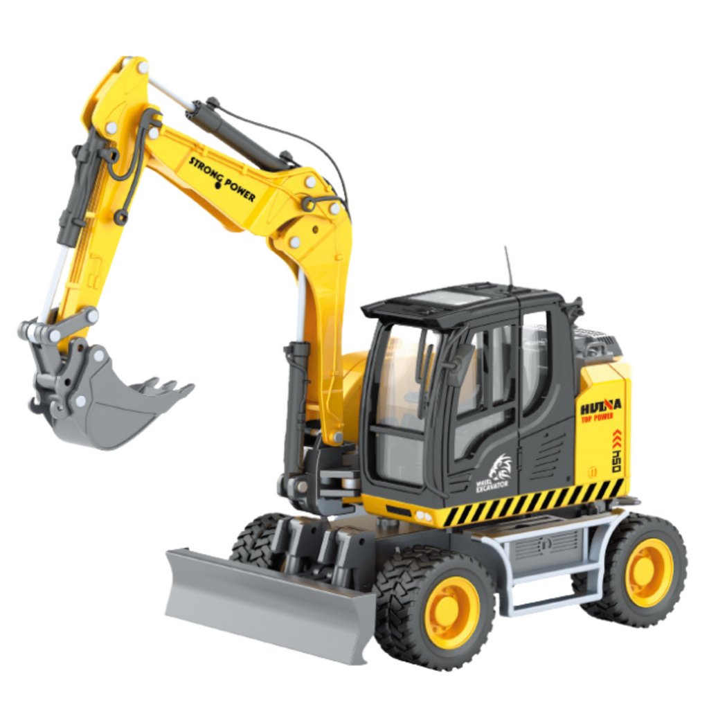 Kovový Kolový Bagr se Strojním Nakladačem Huina ve skále 1:50 je precizně zpracovaný model stavebního stroje, jenž mistrovsky kombinuje funkce bagru a nakladače, čímž nabízí ještě více možností při hře nebo vystavování.