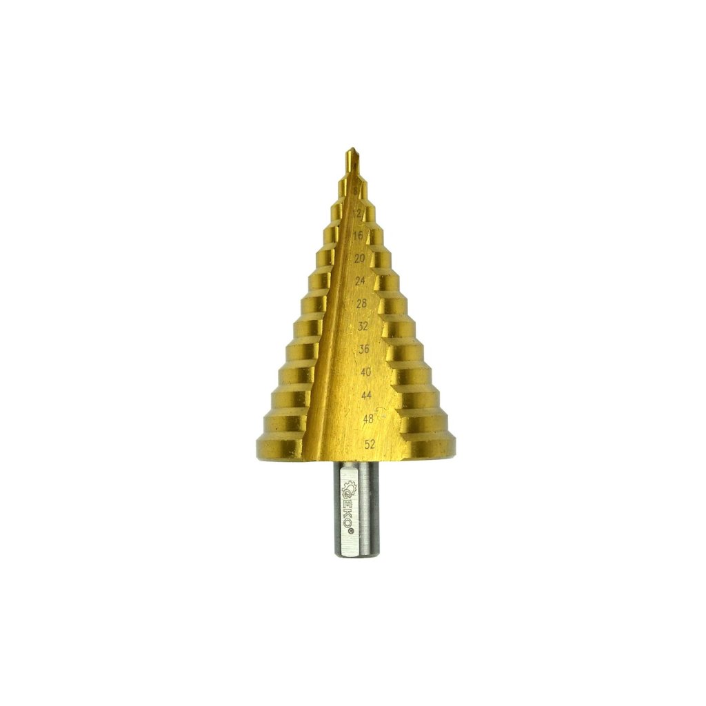 HSS TiN stupňové vrtáky s průměrem vrtání od 4 do 52 mm. Určené pro vrtání do neželezných kovů, ocelových plechů a plastů.