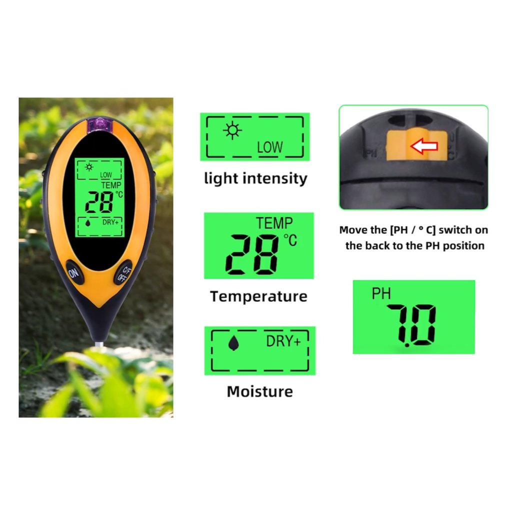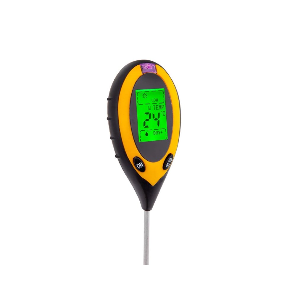 Přístroj umožňující měření kyselosti a vlhkosti půdy, teploty půdy a intenzity slunečního záření.