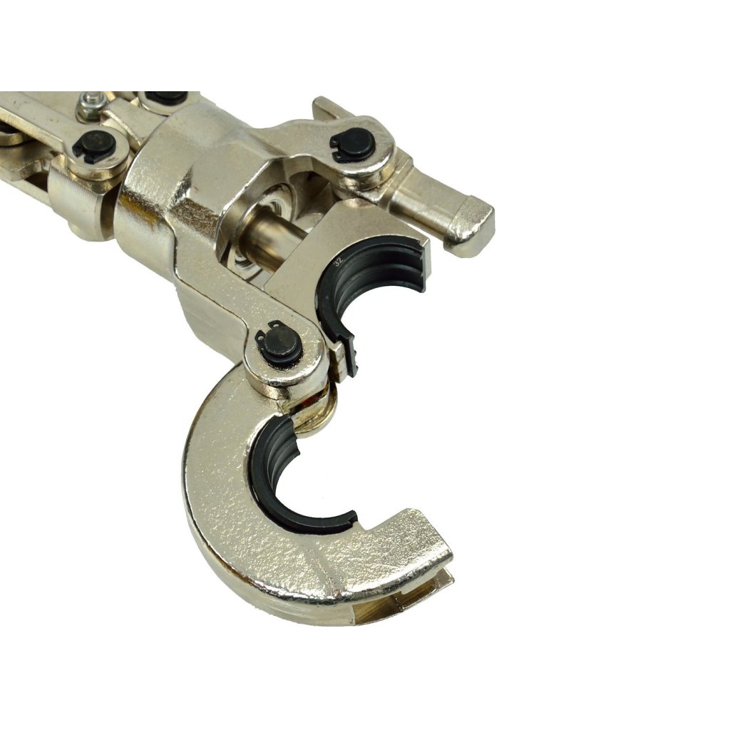 Lis na lisování trubek PEX-AL-PEX. Lisovací kleště pro spojování PEX povýkoní lisovacích spojek. Vyměnitelné čelisti umožňují práci v plném rozsahu průměrů vícevrstvých trubek od 16 mm do 32 mm.