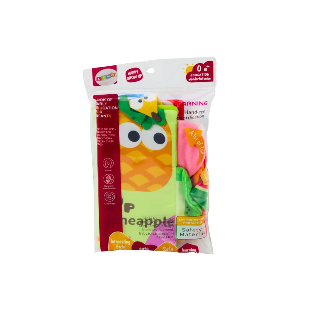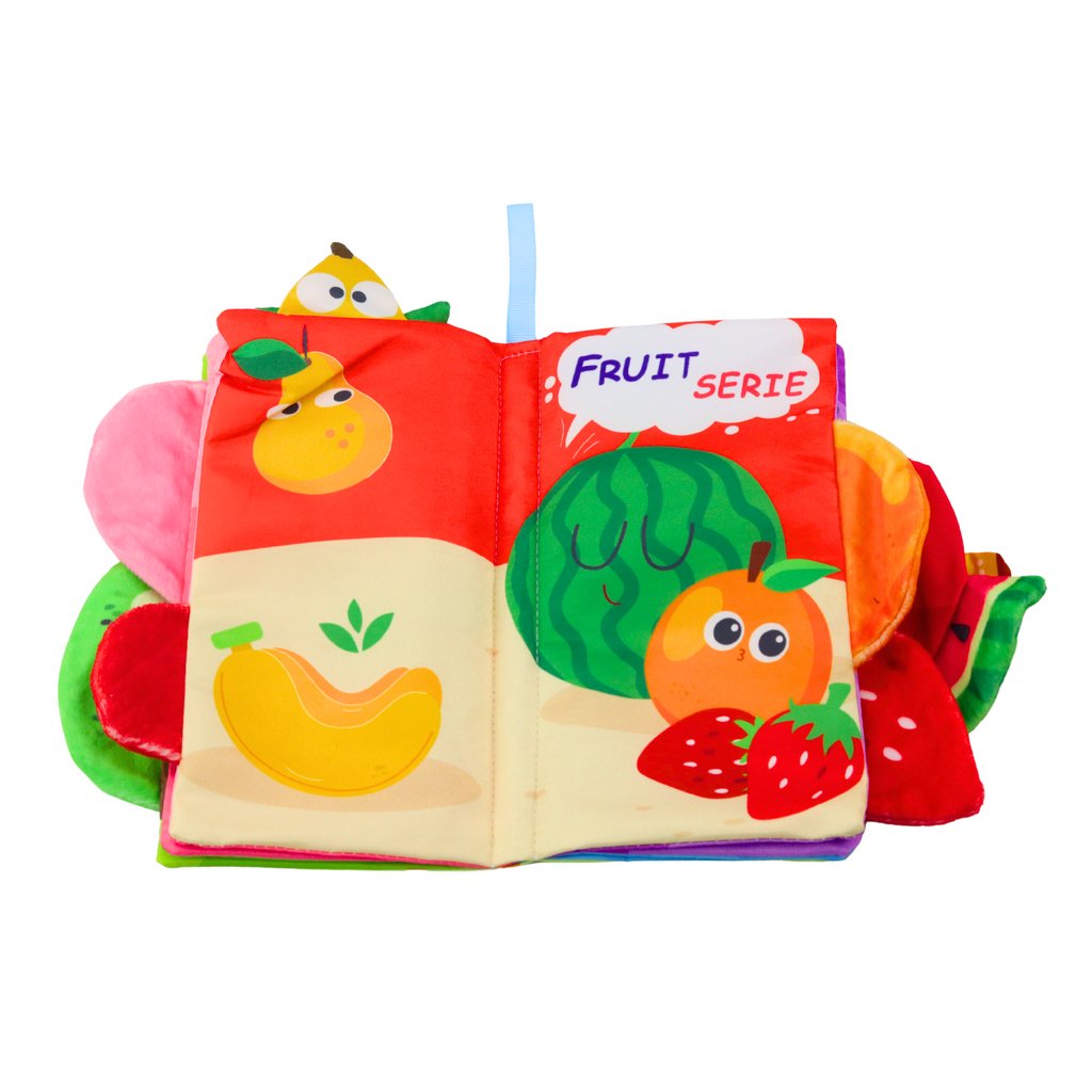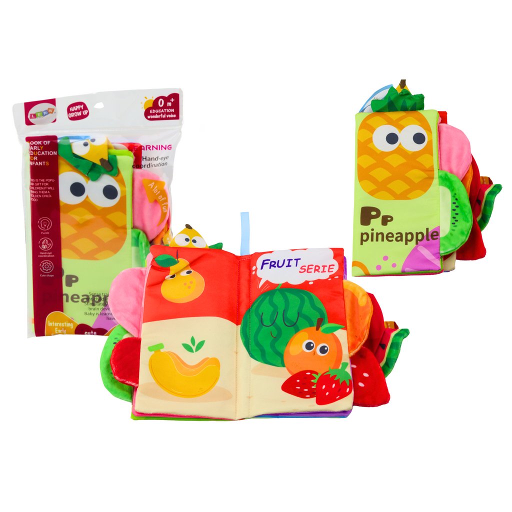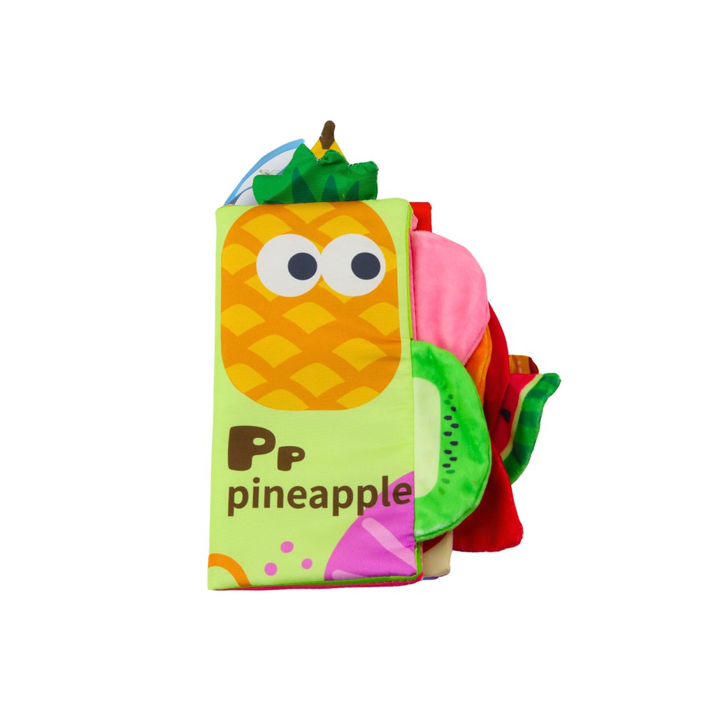 Knížečka je vyrobena z měkkého, bezpečného materiálu, který je příjemný na dotek a odolný proti poškození Každá stránka obsahuje anglické názvy ovoce, což podporuje učení skrze hru a rozvíjí první slovní zásobu dítěte