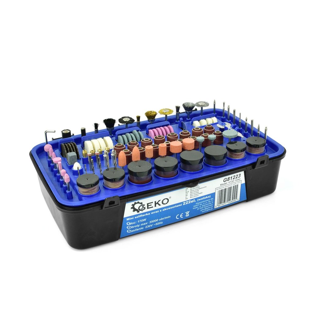 Multifunkční bruska GEKO s kompletní sadou příslušenství 222 ks. Díky velkému množství různých nástavců se mini bruska perfektně hodí pro modelářské práce, drobné opravy, čištění a leštění drobných prvků.