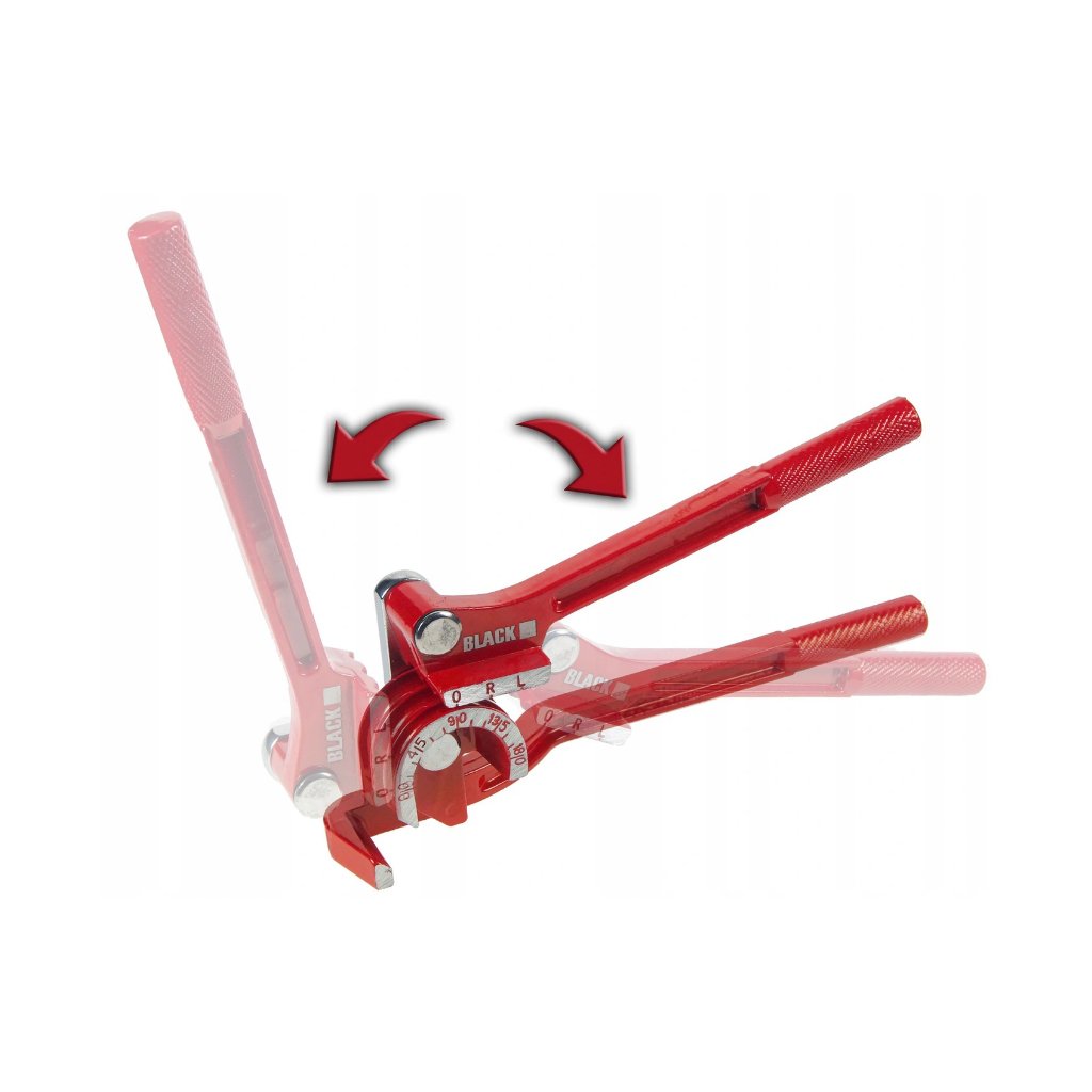 Provedení: Kompaktní konstrukce, tuhá vůči zkrutu. Ukazatel poloměru ohnutí s dělením na stupně 45°; 90°; 135° a 180° s rozdělením na kroky po 15°, ohýbatelné jsou jedním přístrojem 3 rozměry trubek s úzkými poloměry.