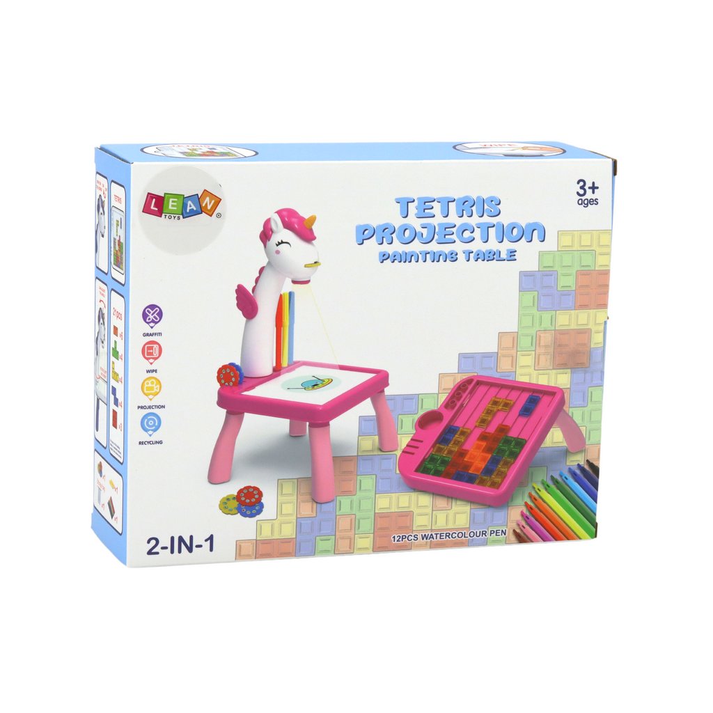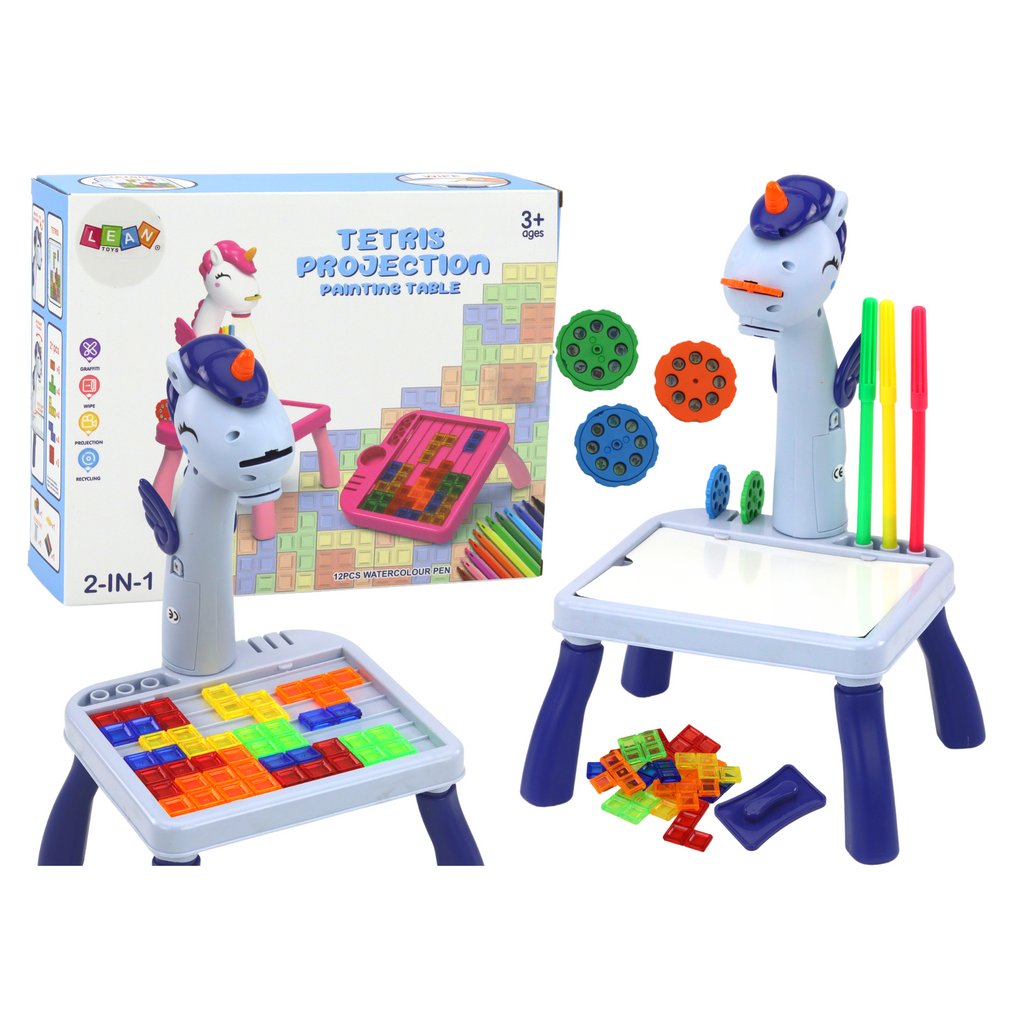 - Mini projektor Tetris 2v1 jednorožec modrý Mini projektor pro výuku kreslení s tetrisem 2v1 je neobvyklá hračka, která nejen baví, ale také učí prostřednictvím interaktivní zábavy