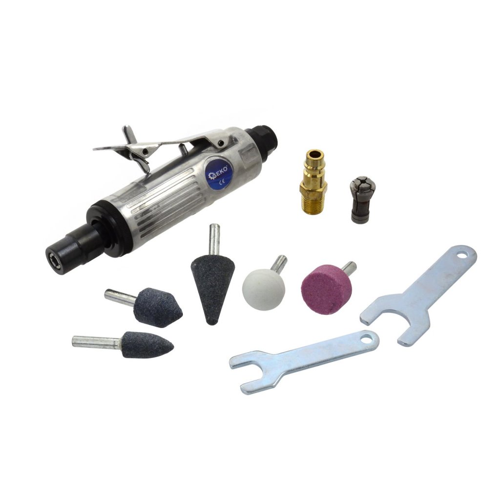 Mini vrtací/brusná pneumatická vrtačka 1/4" se sadou příslušenství. Obsah sady pneumatická bruska 5x brusné kameny 2x plochý klíč: 12, 17 mm šroubovací spojka 1/4" 2x upínací pouzdro 3 a 6 mm