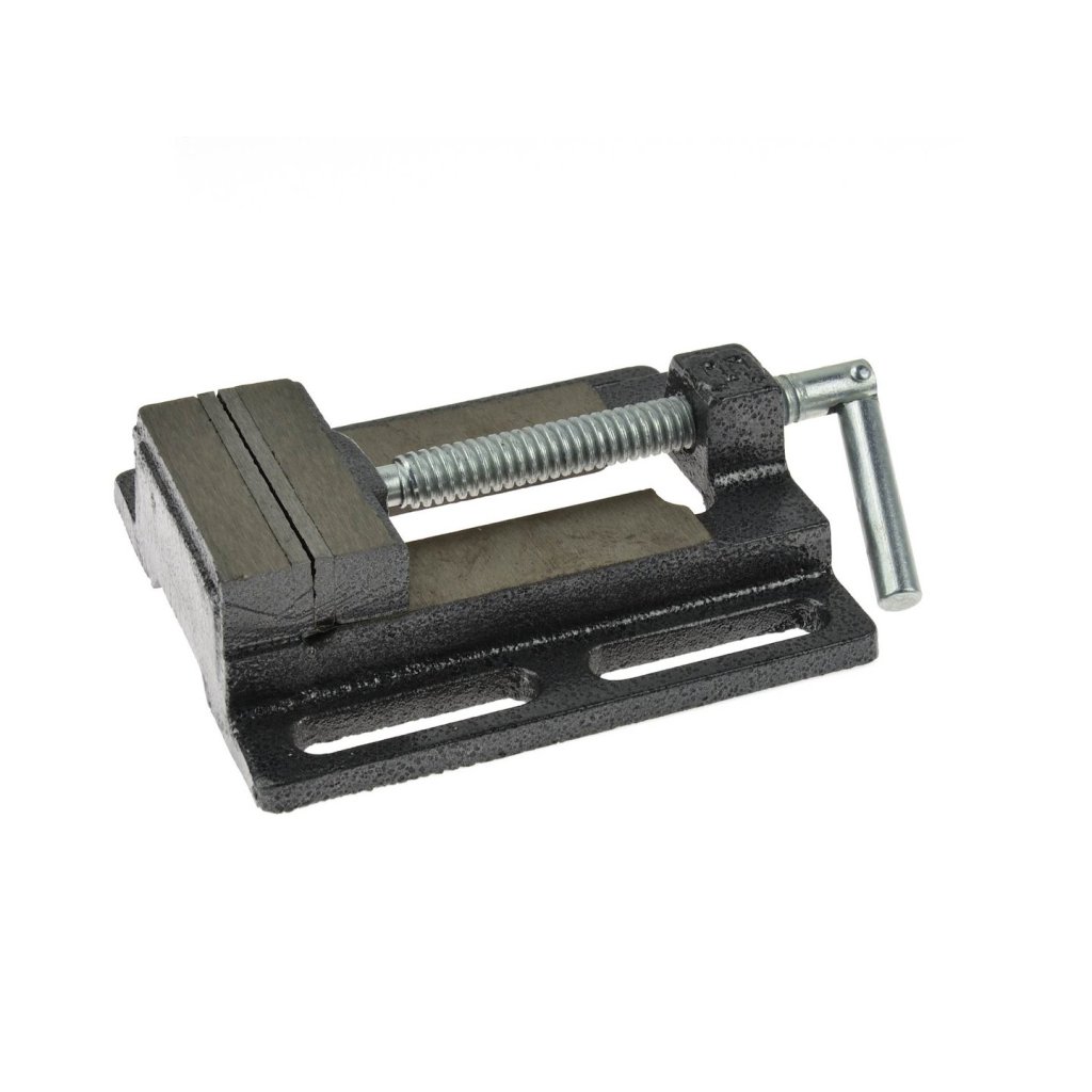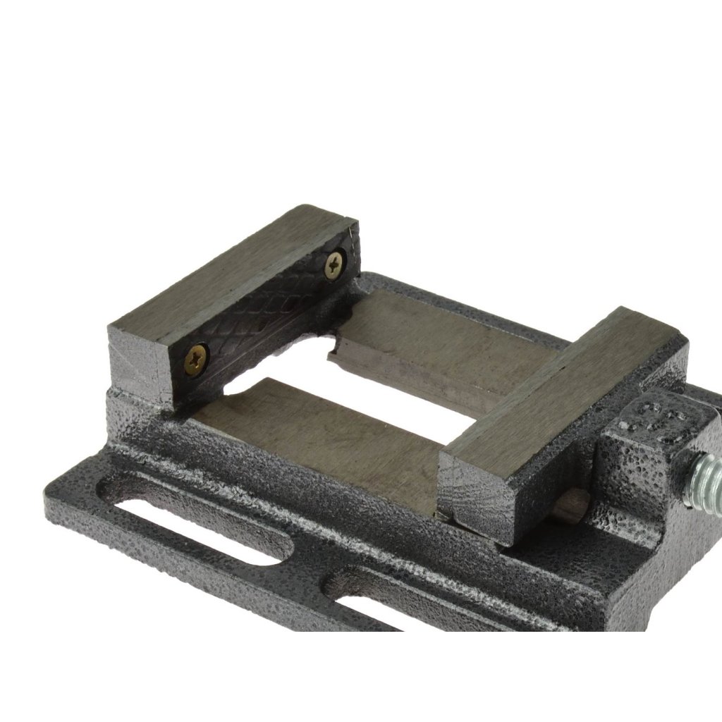 Vrtací svěrák s drážkovanou základnou umožňující snadnou montáž a polohování svěráku. Vyrobeno z litiny s odolnými ocelovými čelistmi s křížovými zářezy.