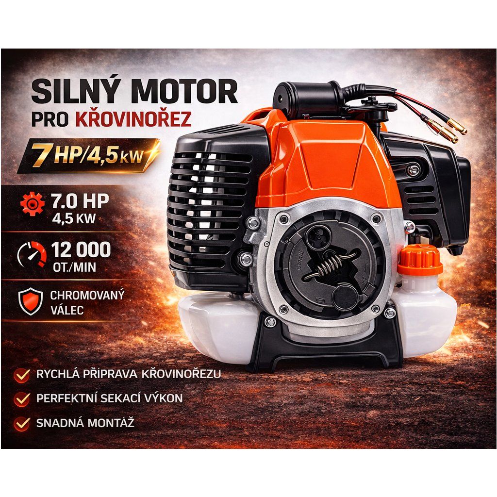 Motor je určen pro mnoho běžných typů benzínových křovinořezů a vyžínačů podobné konstrukce. Před nákupem doporučujeme zkontrolovat rozteč uchycení a kompatibilitu s vaším strojem.