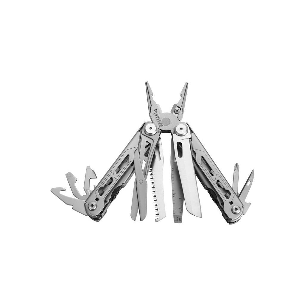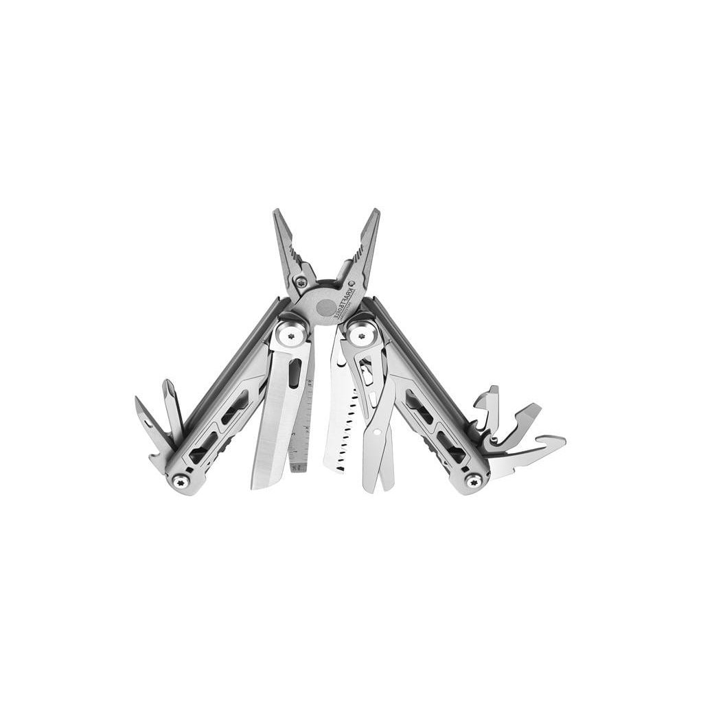 - Vybaven mnoha nástroji včetně: nožíku, kleští, pilky na dřevo, nůžek, křížového i plochého šroubováku, pilníku a sady bitů