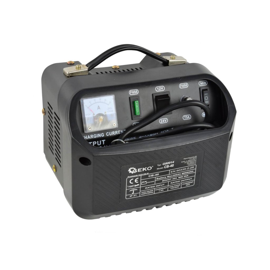 Automatický nabíječ CB-40 je určen k nabíjení olověných akumulátorů (STD) s napětím 12 V nebo 24 V, které se používají mimo jiné v osobních, dodávkových a nákladních automobilech atd. Má zabudovanou pojistku, která chrání zařízení před nesprávným připojením polů a zkratem.