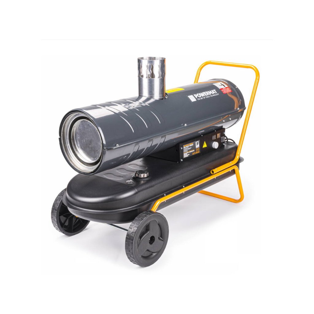 Ventilátor protlačuje zařízení studeným vzduchem a směřuje jej k výstupu topení. Palivo odebrané z nádrže je vstřikováno tryskou do uzavřené spalovací komory, kde elektroda spouští zapalování. Plamen ohřívá výměník tepla a výfukové plyny jsou odváděny ven komínem v horní části skříně. Tepelná energie se přenáší do vzduchu obklopujícího výměník a je vyfukována z ohřívače ve formě rovnoměrného proudu čistého a horkého vzduchu.