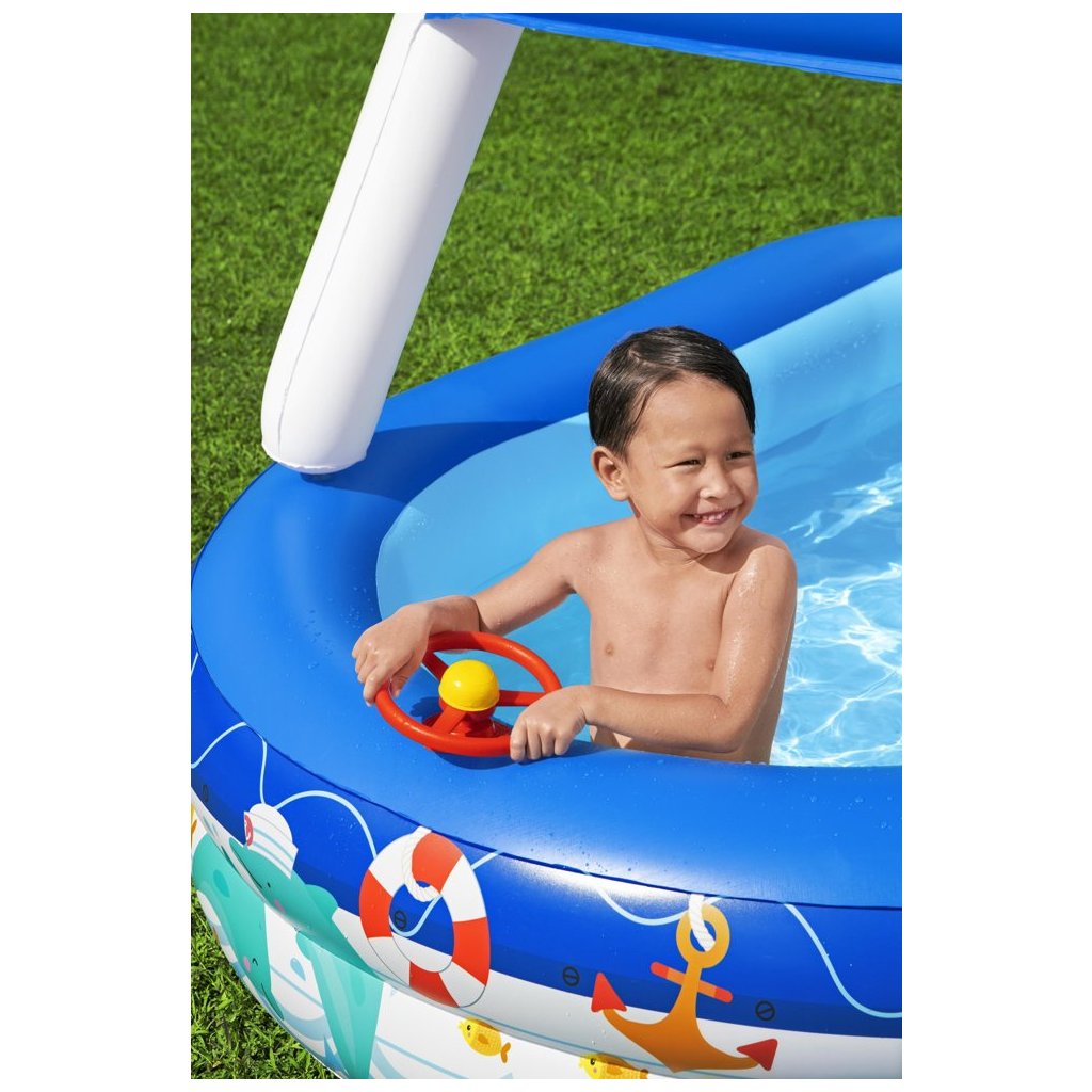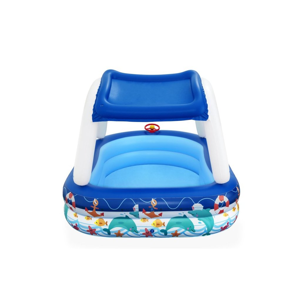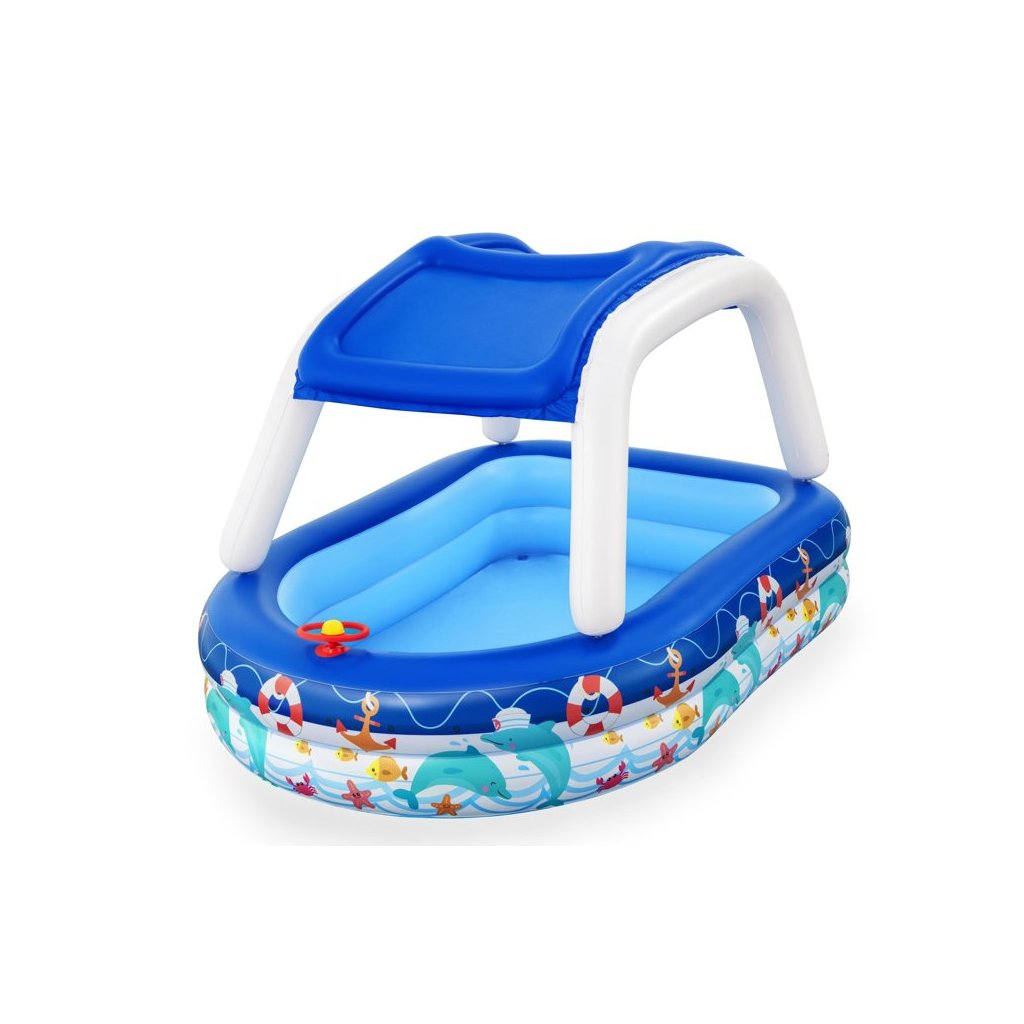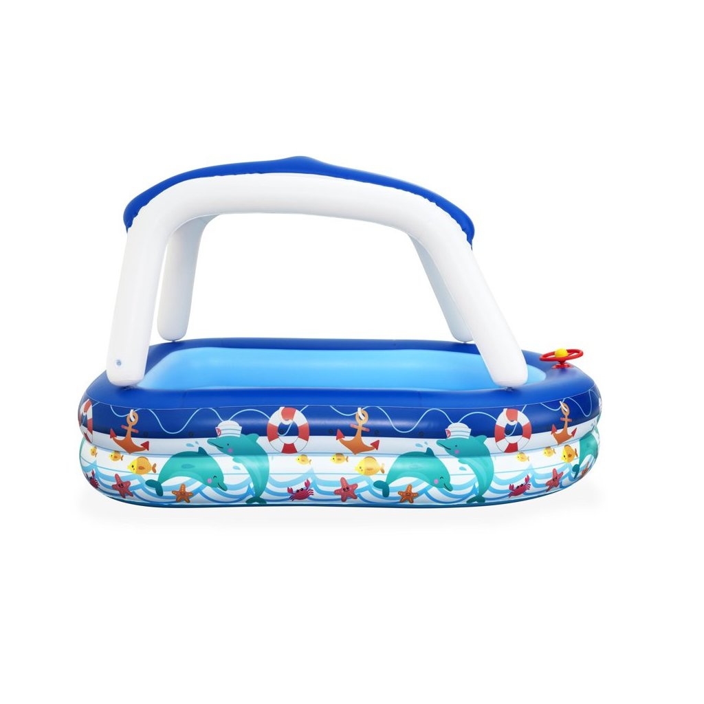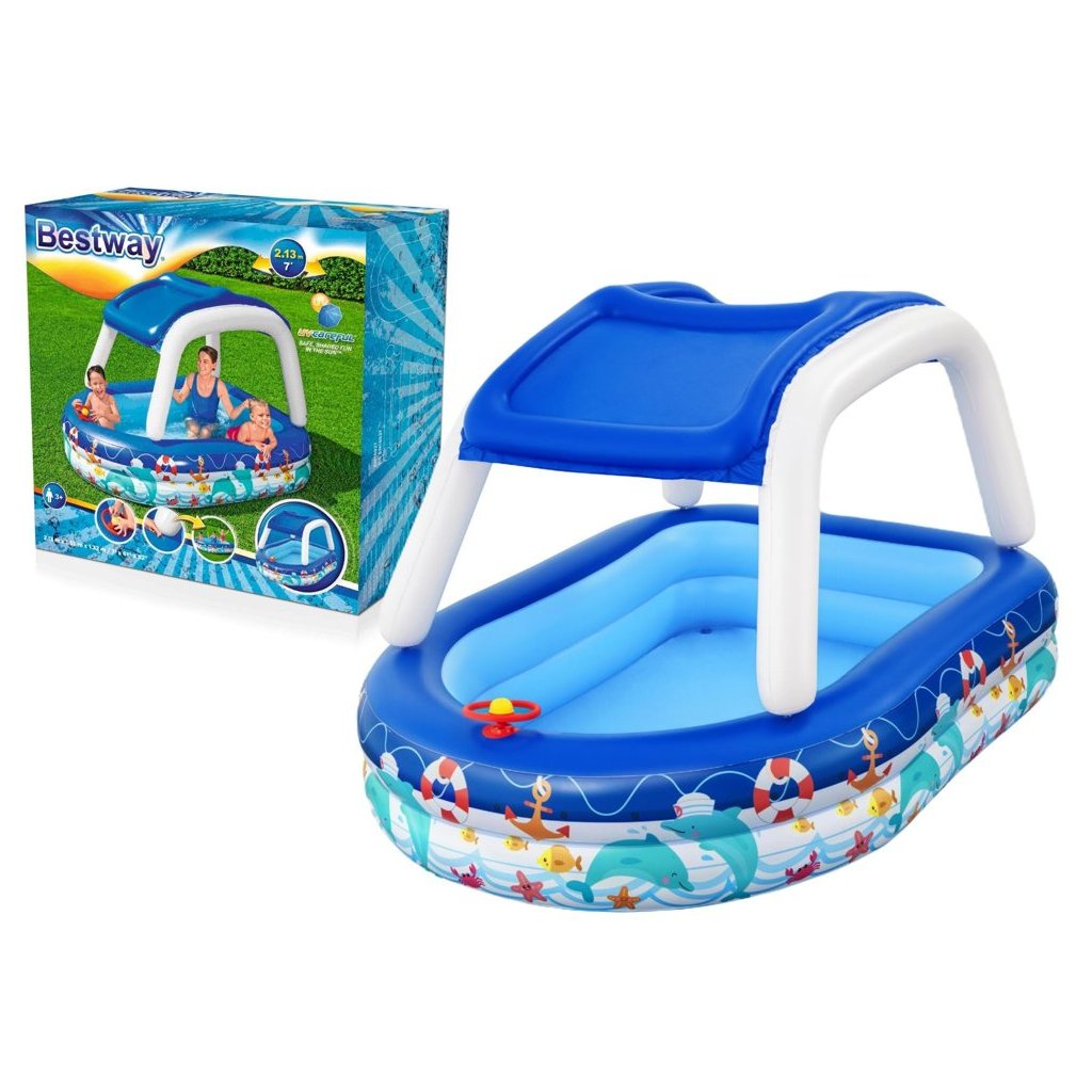 - Nafukovací bazén s baldachýnem 213 x 155 x 132 cm Bestway 54370 Velký, spolehlivý bazén pro celou rodinu, ve kterém si děti mohou volně plavat