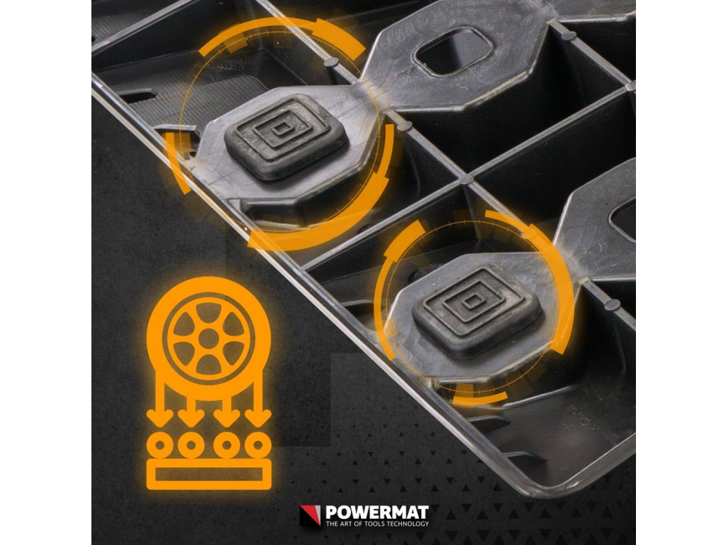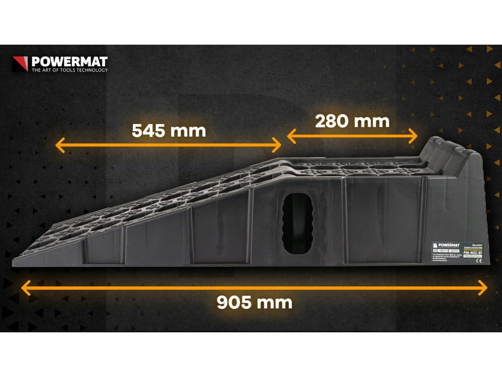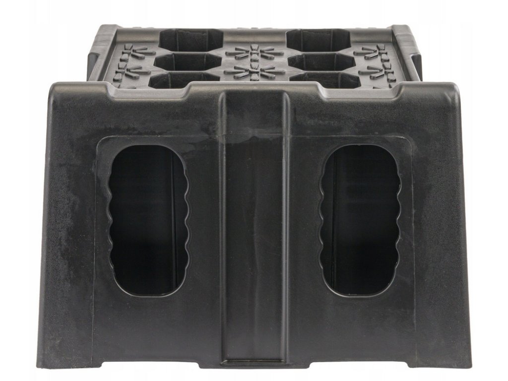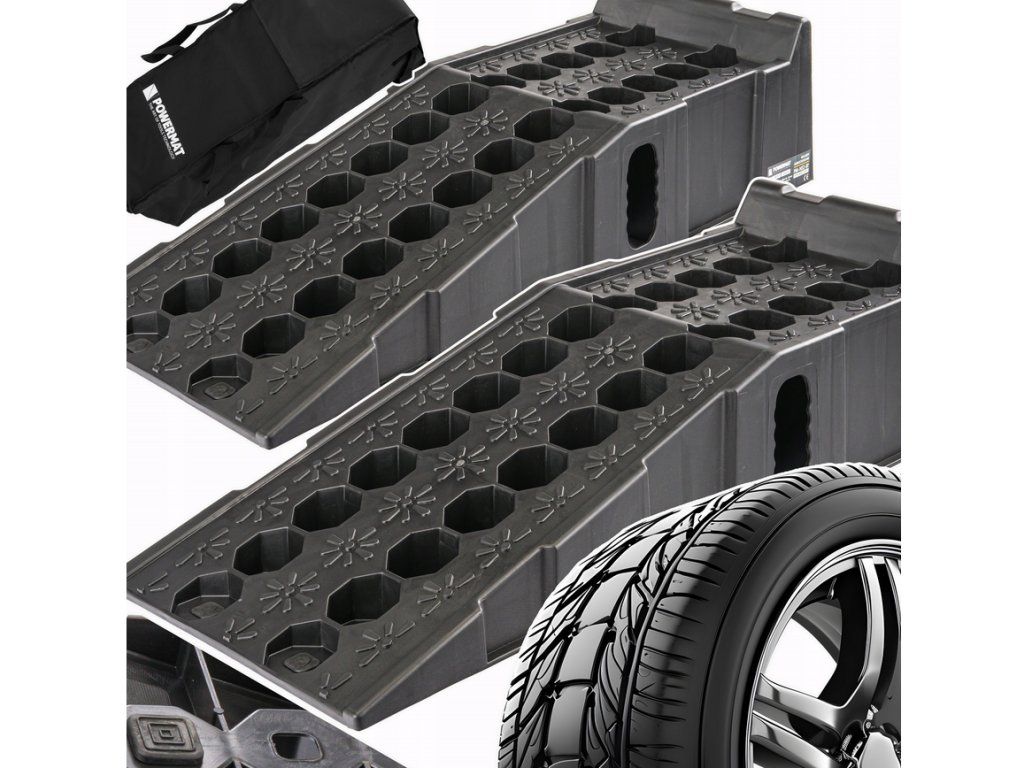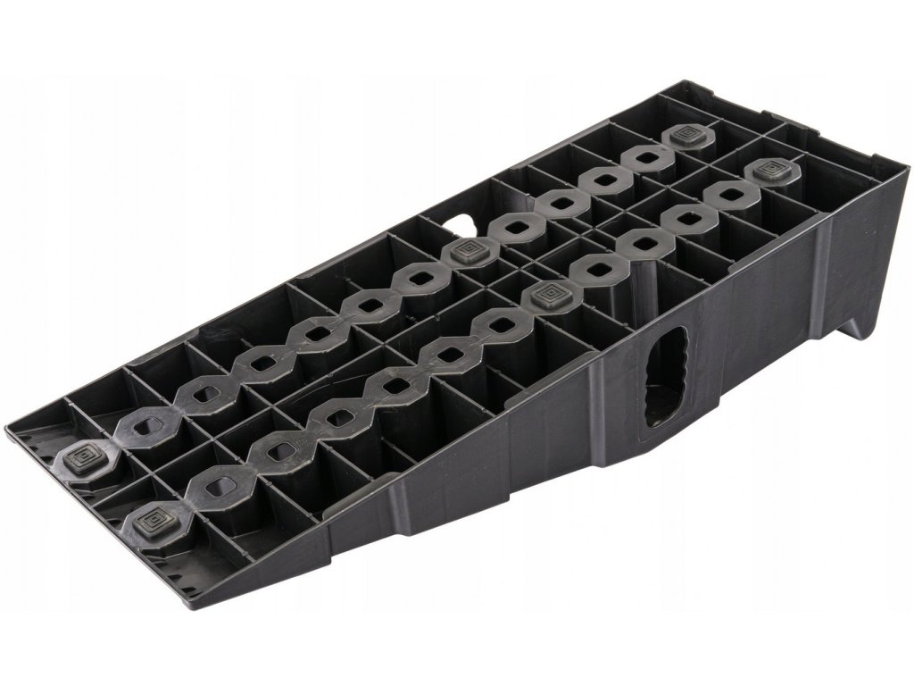 Odolné nájezdy pro osobní a lehká užitková vozidla z HDPE s nosností 8 t za pár (≈ 4 t/rampa). Protiskluzný povrch, 6 gumových podložek proti posunu, vysoký doraz pro bezpečné zastavení a voděodolný obal pro přenášení a skladování. Rozměry jedné rampy: 905 × 265 × 180 mm.