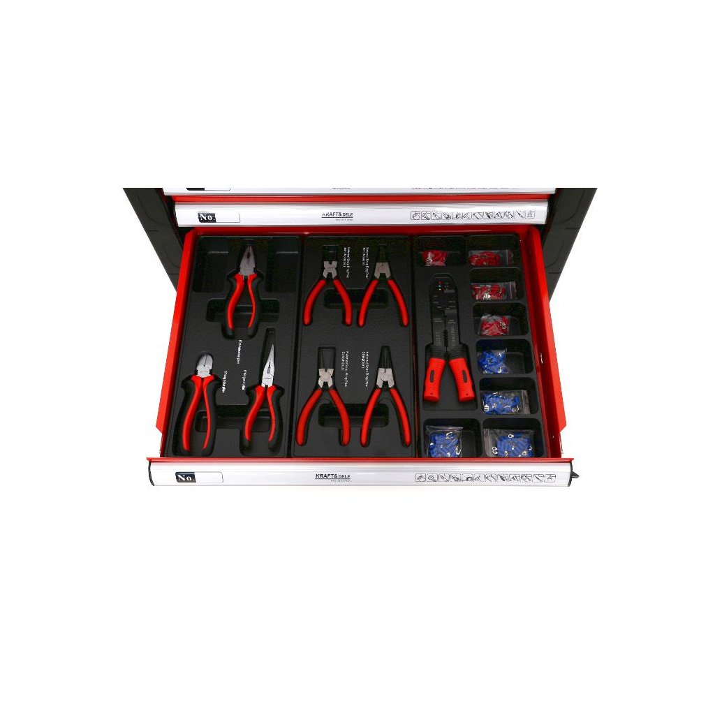 - Čtvrtý šuplík: Uložte si kleště, krimpovací kleště a elektrické konektory přesně tam, kde je budete očekávat.