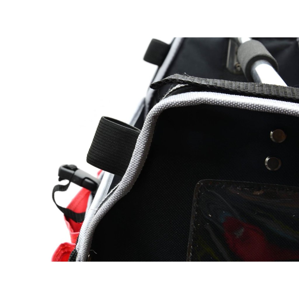 - Po stranách elastická síťovaná kapsa, místo na štítek, úchyt na metr, kapsa zapínaná na suchý zip a pásek zapínaný na sponu