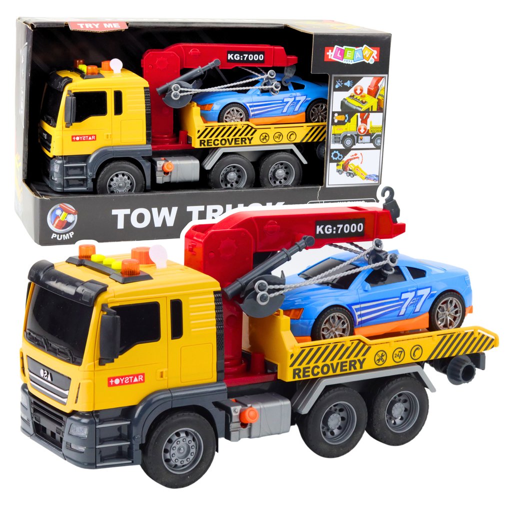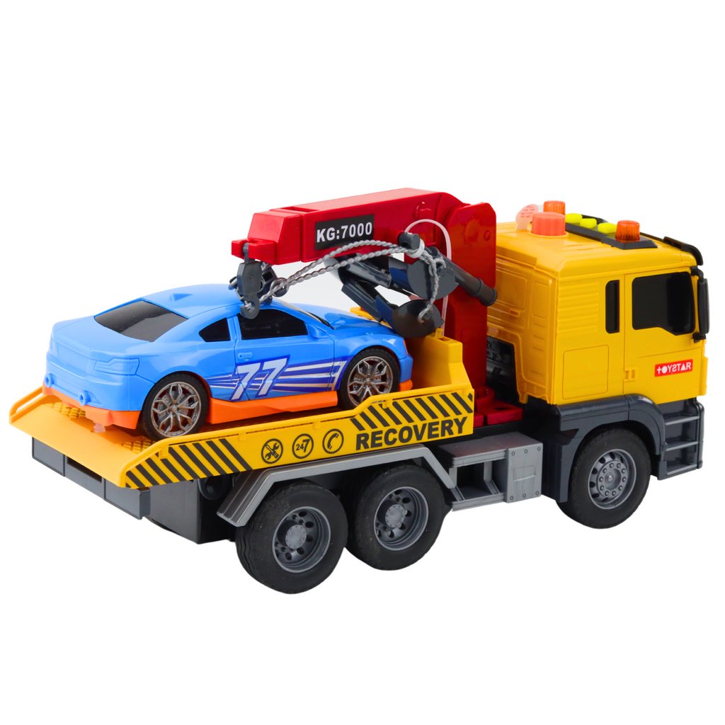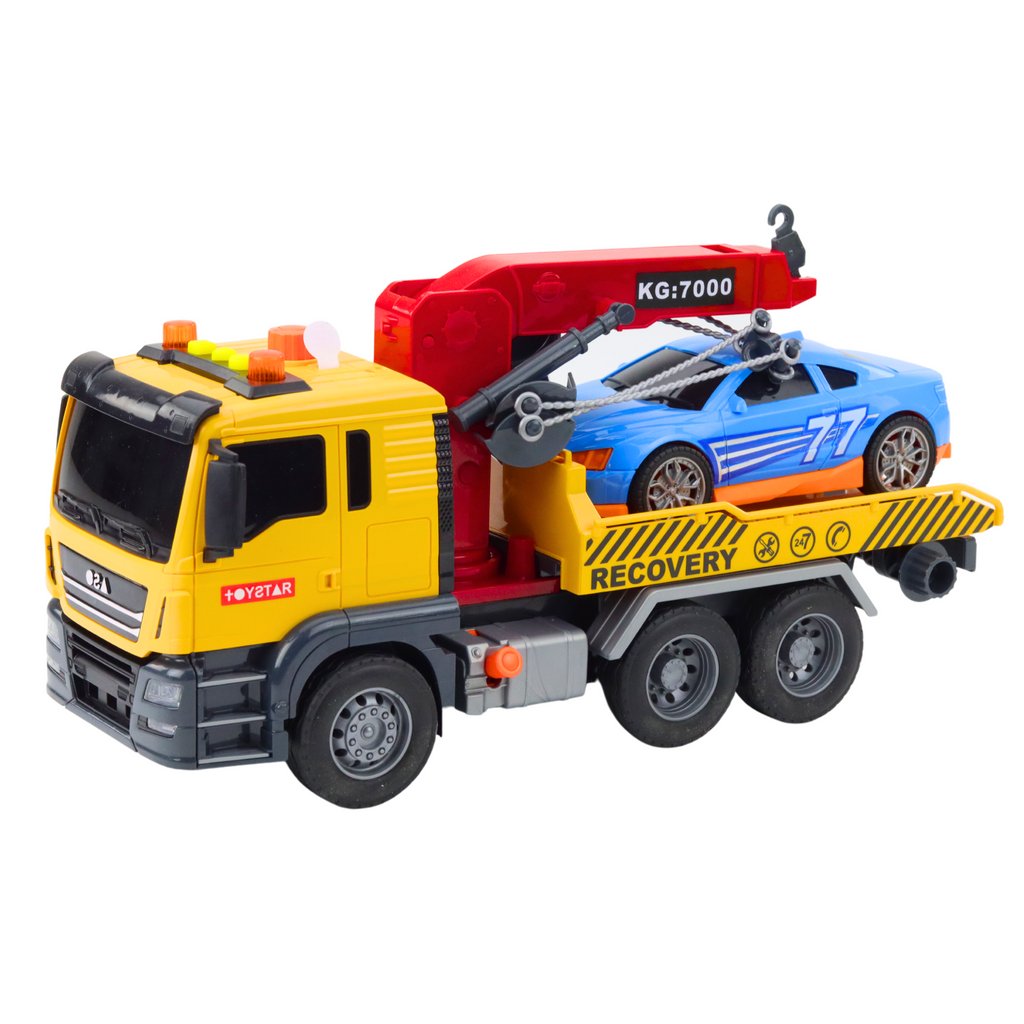 Odtahový vůz s jeřábem, závodním autem, světly a zvuky