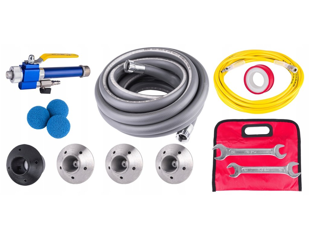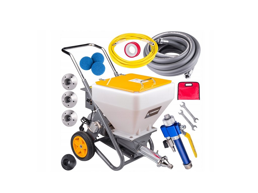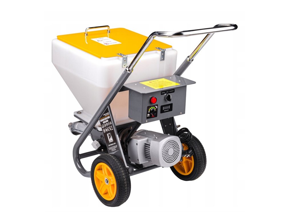 Výkonný a mobilní agregát na omítky pro sádrové i vápenocementové směsi, stěrky a vybrané samonivelační materiály. Motor 1500 W, průtok až 15 l/min a pracovní tlak do 10 bar výrazně urychlí práce na větších plochách. Zásobník 50 l (v materiálech uváděno i 50 kg) a šnekové čerpadlo si poradí se zrnitostí až 4–6 mm. Materiálová hadice 10 m (Ø 25 mm) + vzduchová 11 m (12×8 mm) poskytují pohodlný dosah; max. dopravní výška 15 m. Minimální požadavek na kompresor: ≥ 320 l/min.