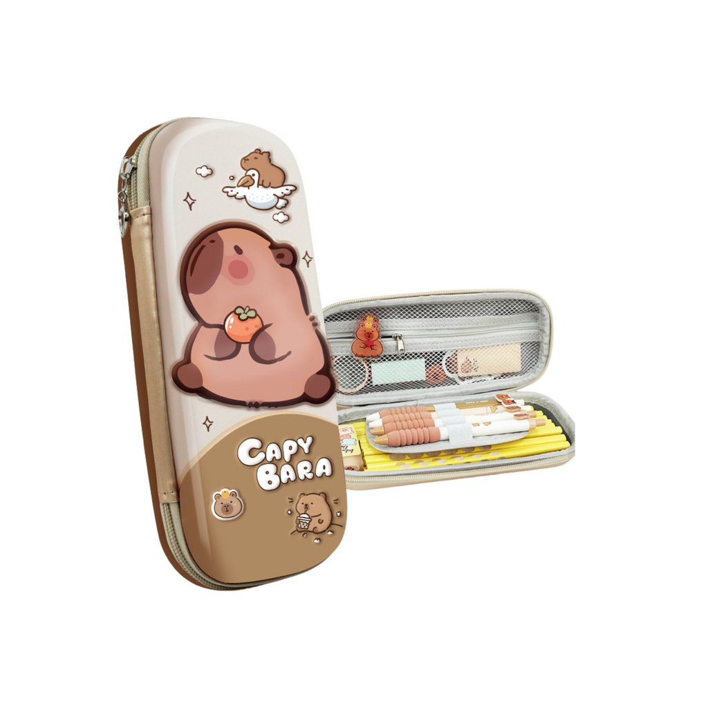 Vylepšete svůj školní den s tímto stylovým piórnikem, který kombinuje funkčnost s jedinečným designem. Motiv kapibary na tomto piórniku přináší hravost a jedinečnost, která si získá srdce každého žáka. Pastelová béžová barva je ideální pro milovníky těchto přátelských zvířat.