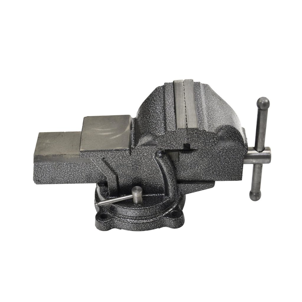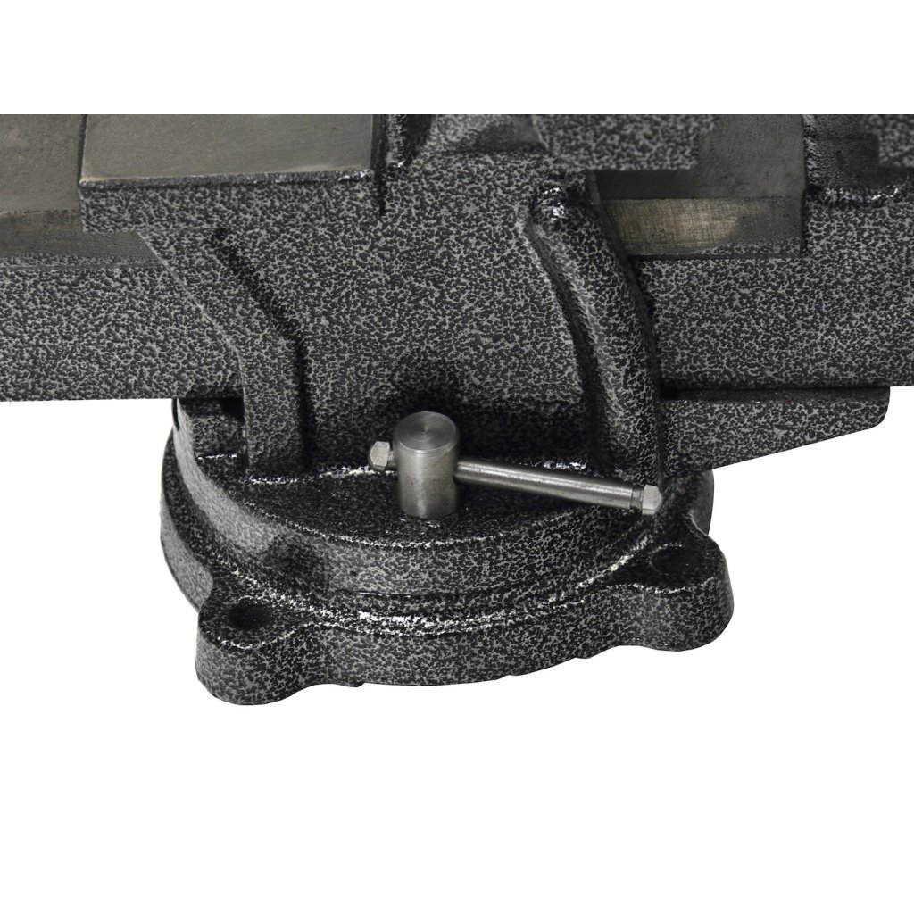 Otočné svěrák, vyrobený z vysoce kvalitních materiálů. Ocelové čelisti svěráku s protiskluzovými křížovými zářezy, navíc kalené. Odolná a pevná konstrukce umožňuje bezpečně upevnit vybraný předmět ve svěráku a zaručuje dlouhou životnost.