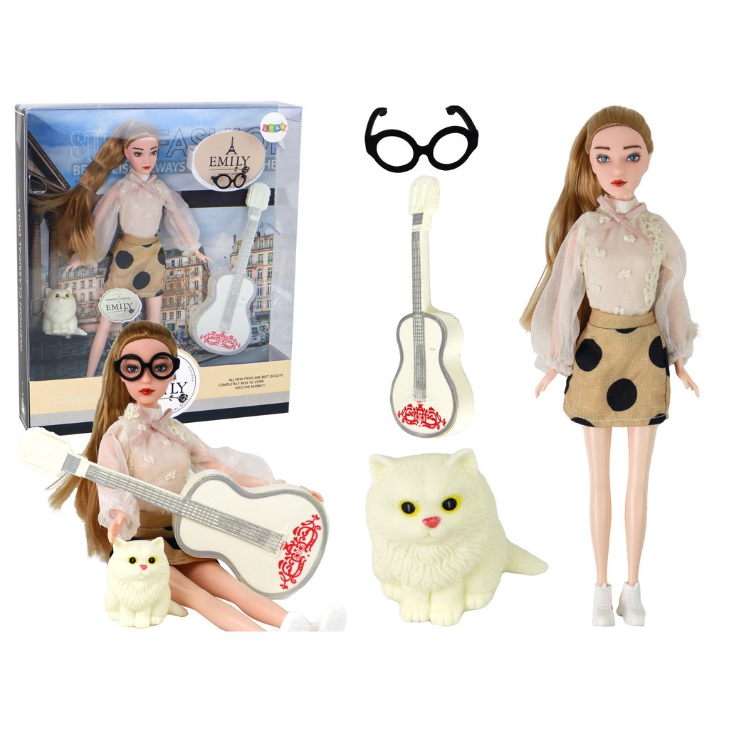 - Panenka pro děti Emily s kytarou, brýlemi, dlouhými blond vlasy a koťátkem Představujeme panenku Emily s kytarou a roztomilým kamarádem, bílým koťátkem, které po stisknutí vydává pískavé zvuky