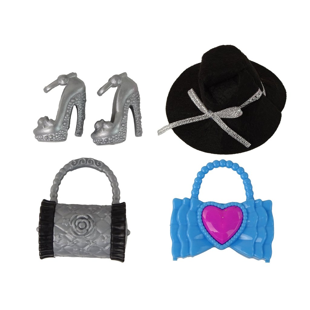 - V balení najdete širokou škálu doplňků, včetně elegantního černého klobouku, modré a šedé kabelky, a vyměnitelných šedých bot