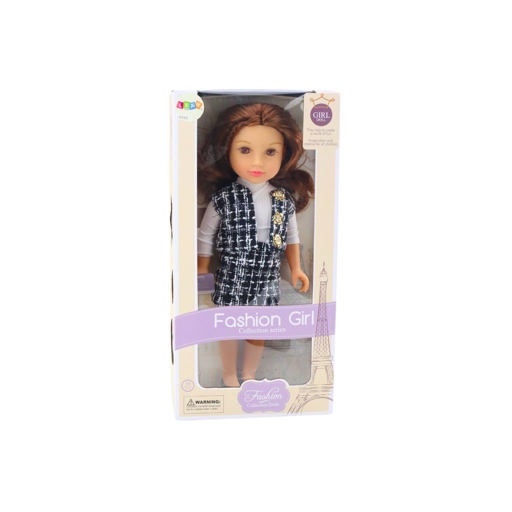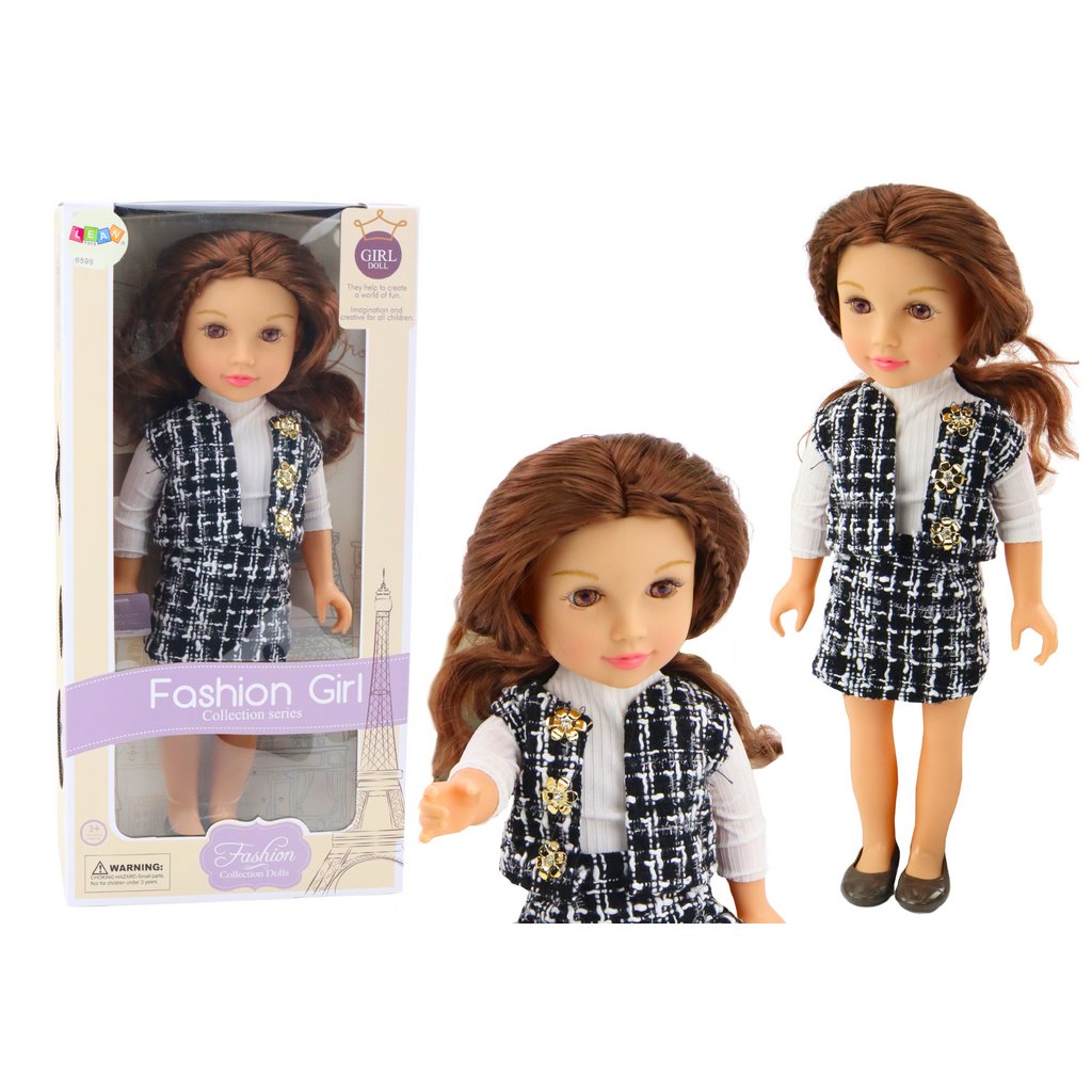Loutka v elegantním oblečení s hnědými vlasy a stylovým kostkovaným vzorem představuje ideální hračku pro každou dívku, která zbožňuje módu, stylizaci a vytváření jedinečných účesů.