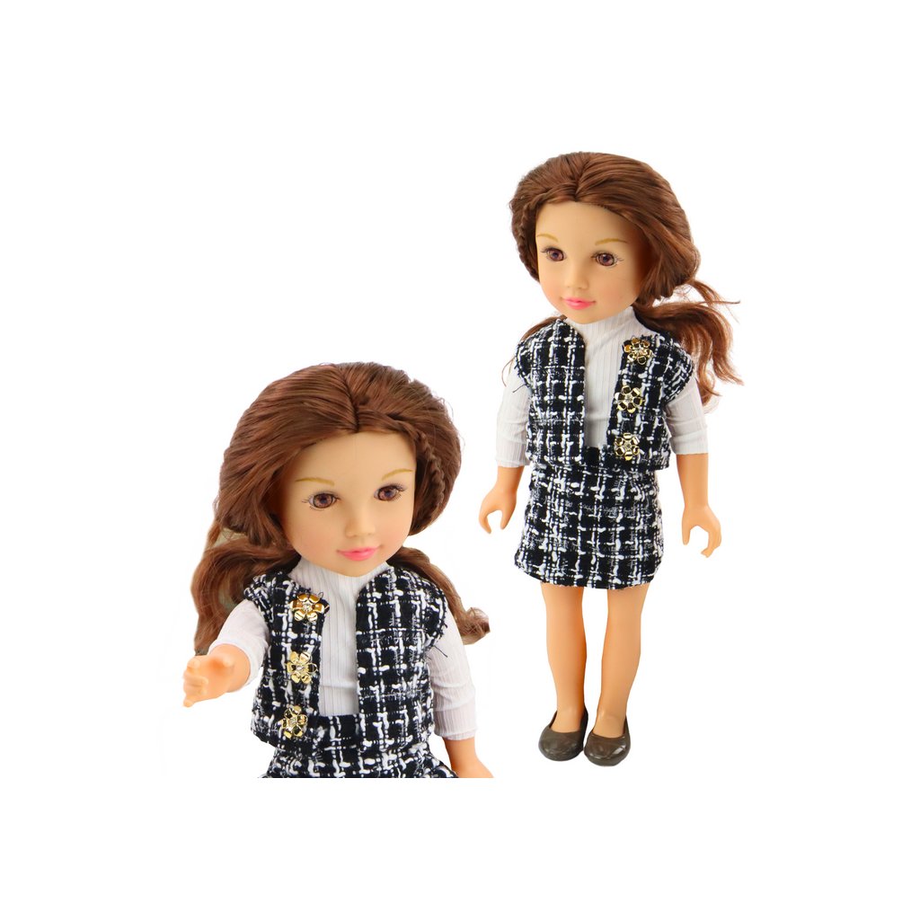 - Outfit loutky kombinuje sukni a vestu v černo-bílé kostce s klasickou bílou blůzkou, což vytváří elegantní a nadčasový vzhled