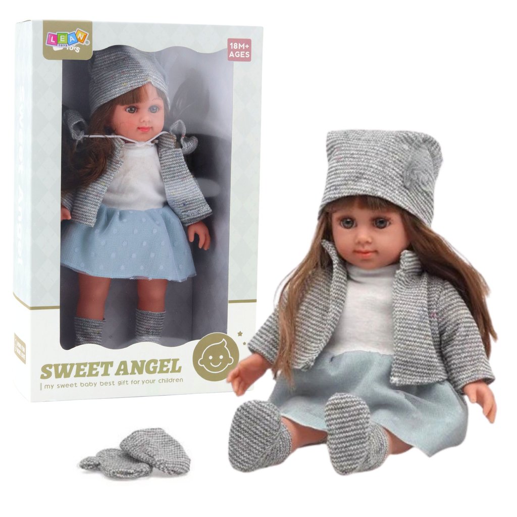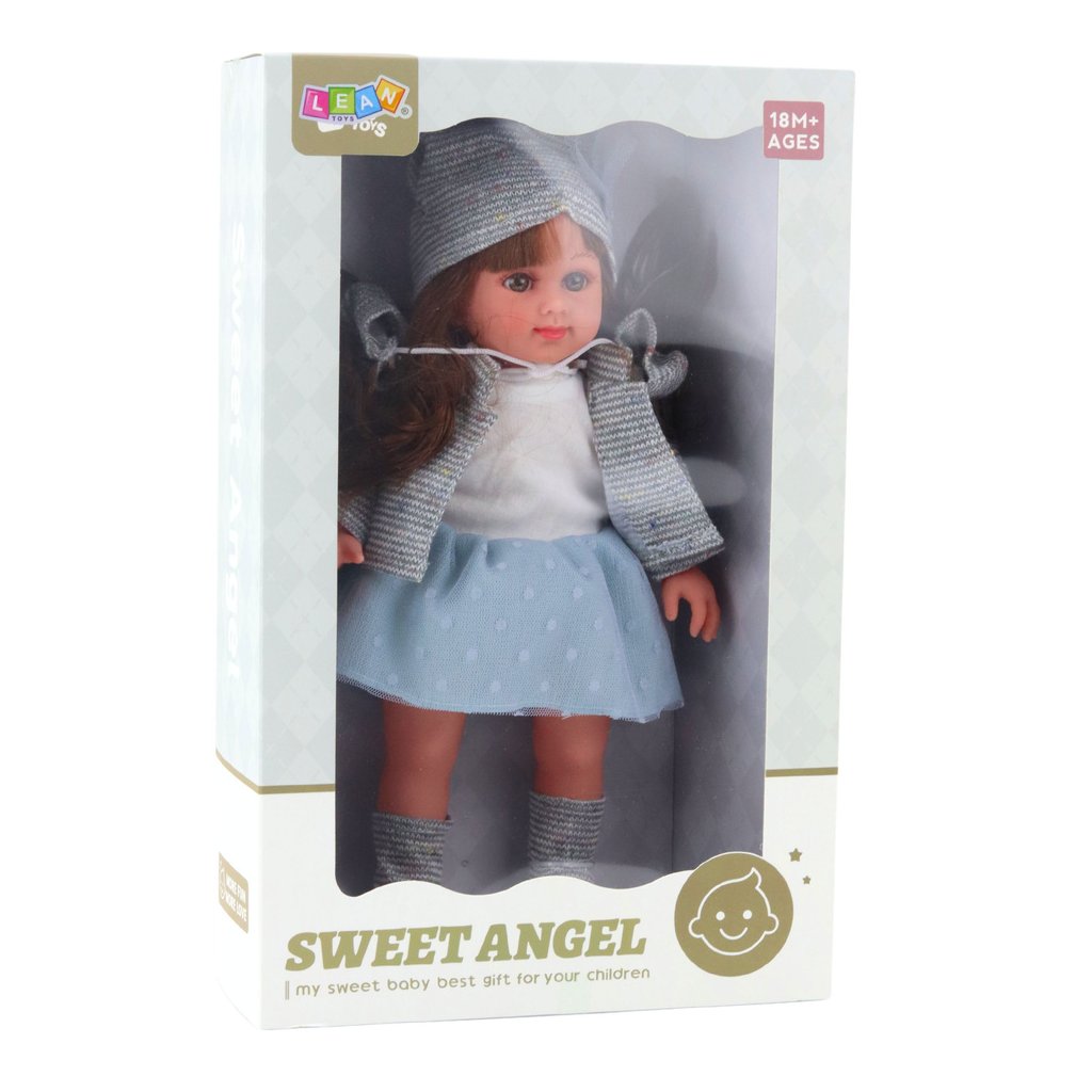 Loutka Sweet Angel v modrých šatech je jedinečnou nabídkou pro nejmenší milovnice hraní na domácnost a hraní rolí Tato roztomilá panenka o výšce 36,5 cm je oblečena do stylové, modré soupravy skládající se z šatů, svetru, botiček a čepice, které jí dodávají elegantní a zároveň útulný charakter