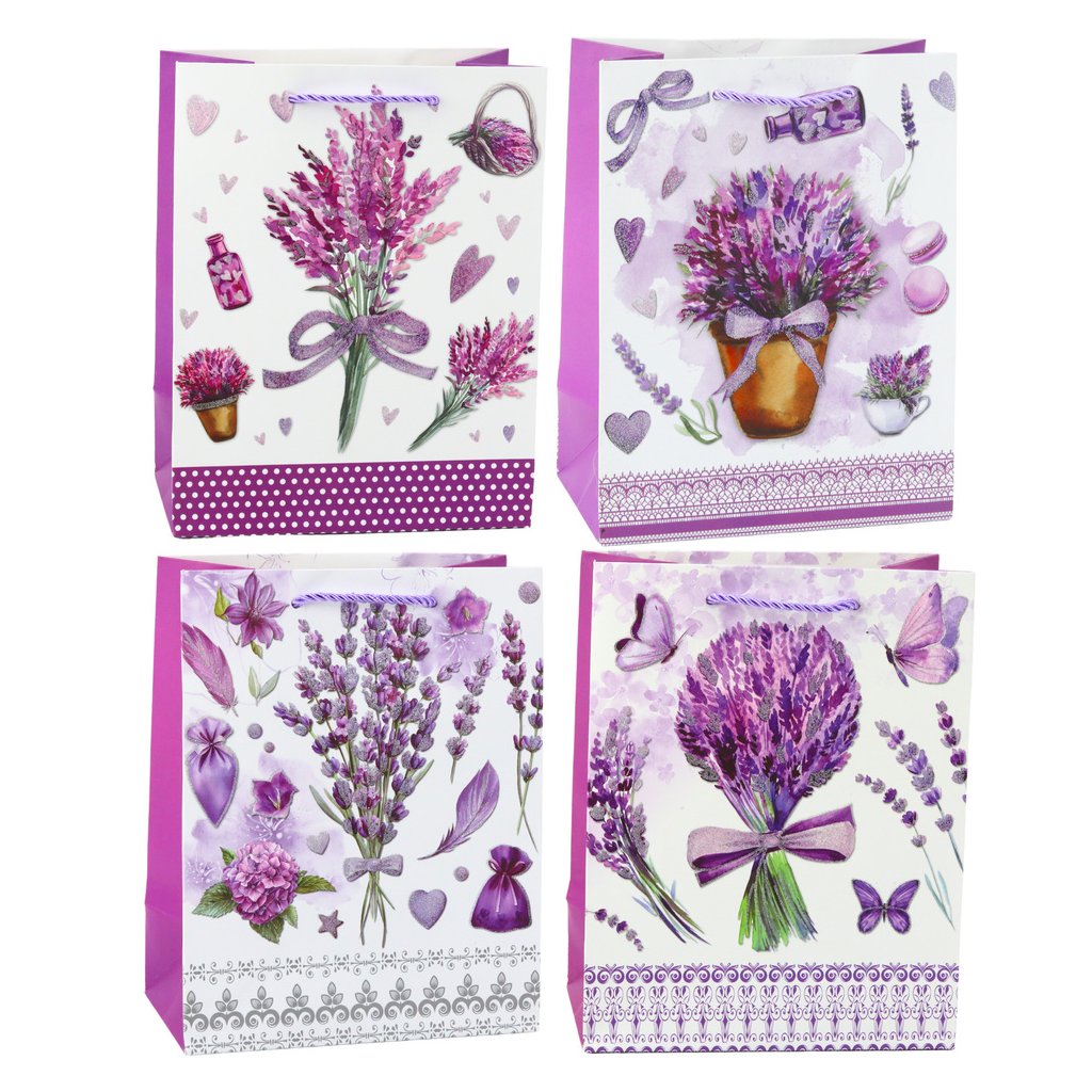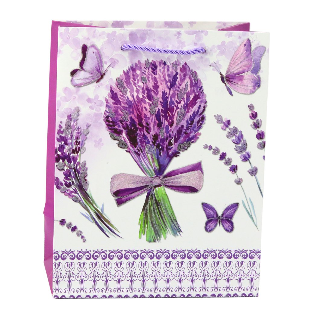 - Papírová dárková taška s motivem levandule a třpytivými prvky nabízí elegantní a stylové balení vašich dárků