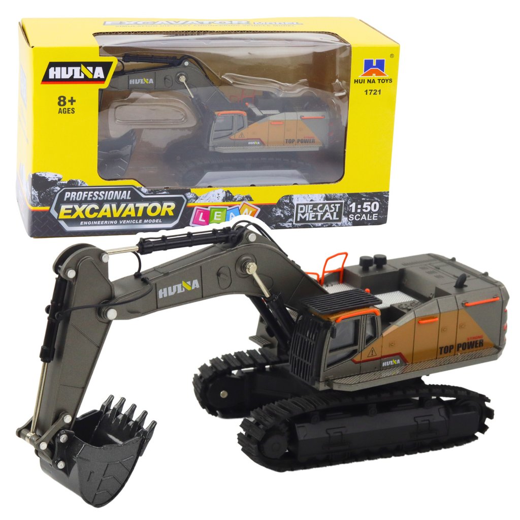 - Pásový kovový bagr Huina 1:50 představuje model v měřítku 1:50, který věrně napodobuje skutečné stavební stroje