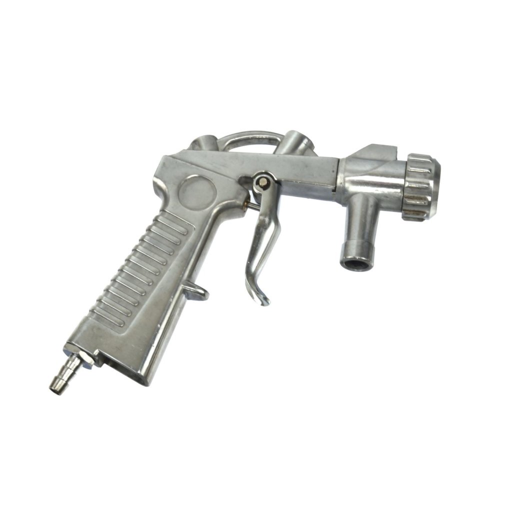 Pískovací pistole v sadě se 4 keramickými tryskami. Používá se mimo jiné k čištění kovových ráfků, odstraňování rzi, čištění různých povrchů od zbytků barvy a jiných nečistot a k matování skla. S pistolí lze používat různé abrazivní materiály, jako jsou: písek, korund, skleněné mikrokuličky, ocelové a litinové broky.