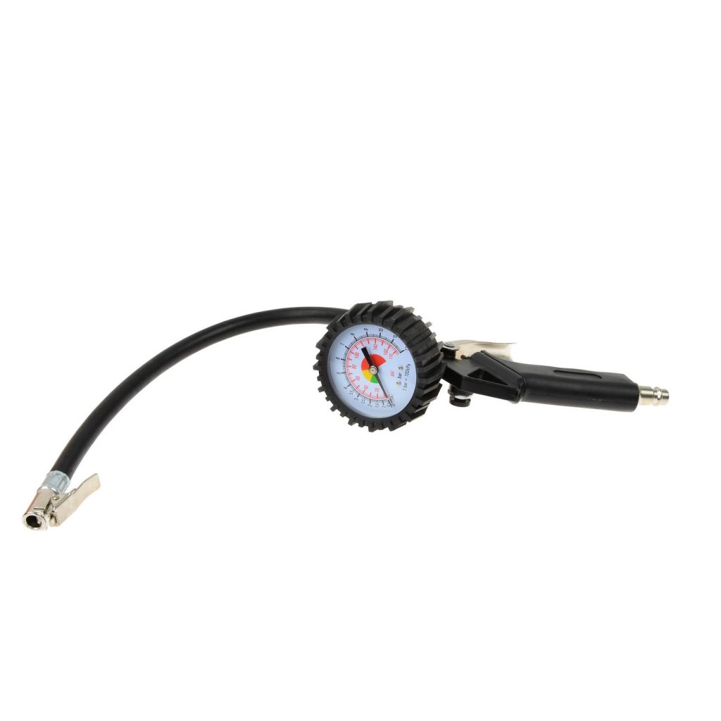 Profesionální pneumatická pistole s manometrem– pro huštění pneumatik osobních a nákladních automobilů. Vybavenaohebnou hadicí o délce 37 cma velkým čitelným manometrem vgumovém krytu chránícím před otřesy a nárazy. Měřicí stupnice ve dvou jednotkách –Psi a Bar. Rychlospojka 1/4"umožňuje rychlé připojení ke kompresoru.