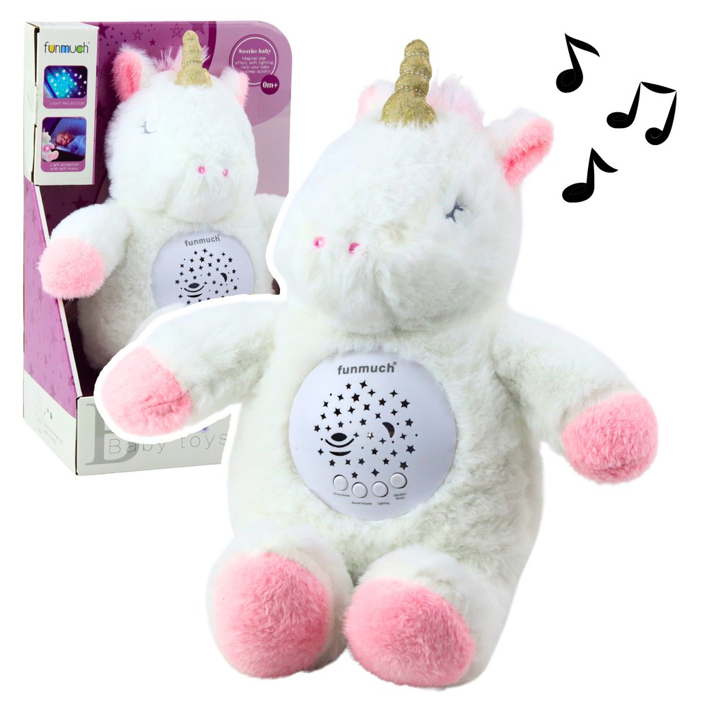 - Pluskový jednorožec s projektorem a melodiemi je měkká, funkční a mimořádně roztomilá hračka vytvořená s ohledem na kojence