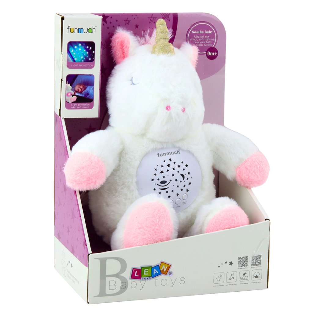 Pluskový jednorožec s projektorem a melodiemi je měkká, funkční a mimořádně roztomilá hračka vytvořená s ohledem na kojence – vhodná už od prvních dnů života.