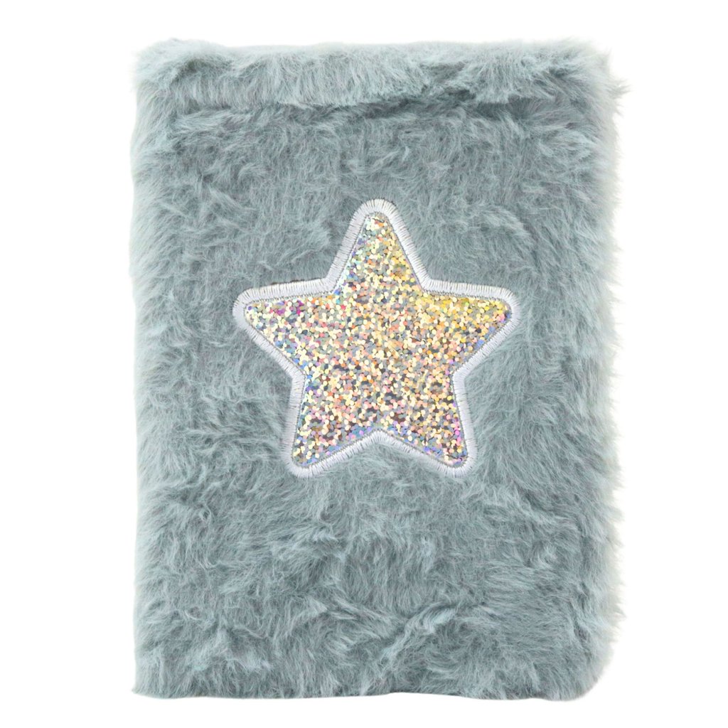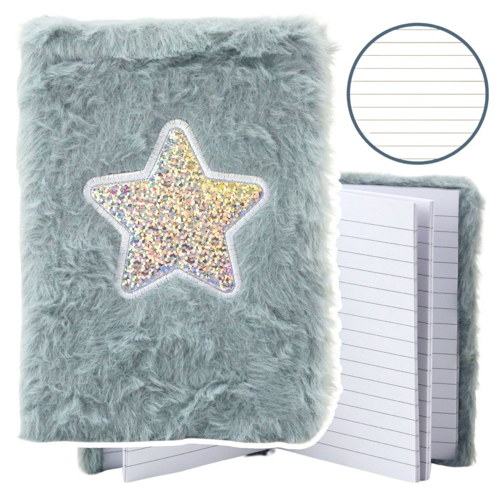 Na přední straně je umístěna třpytivá aplikace ve tvaru hvězdy, která se leskne v různých barvách, a vytváří tak efektní kontrast s měkkým materiálem Uvnitř zápisníku se nachází 80 línkovaných listů, které je ideální pro každodenní záznamy, vedení deníku, kresby nebo školní poznámky
