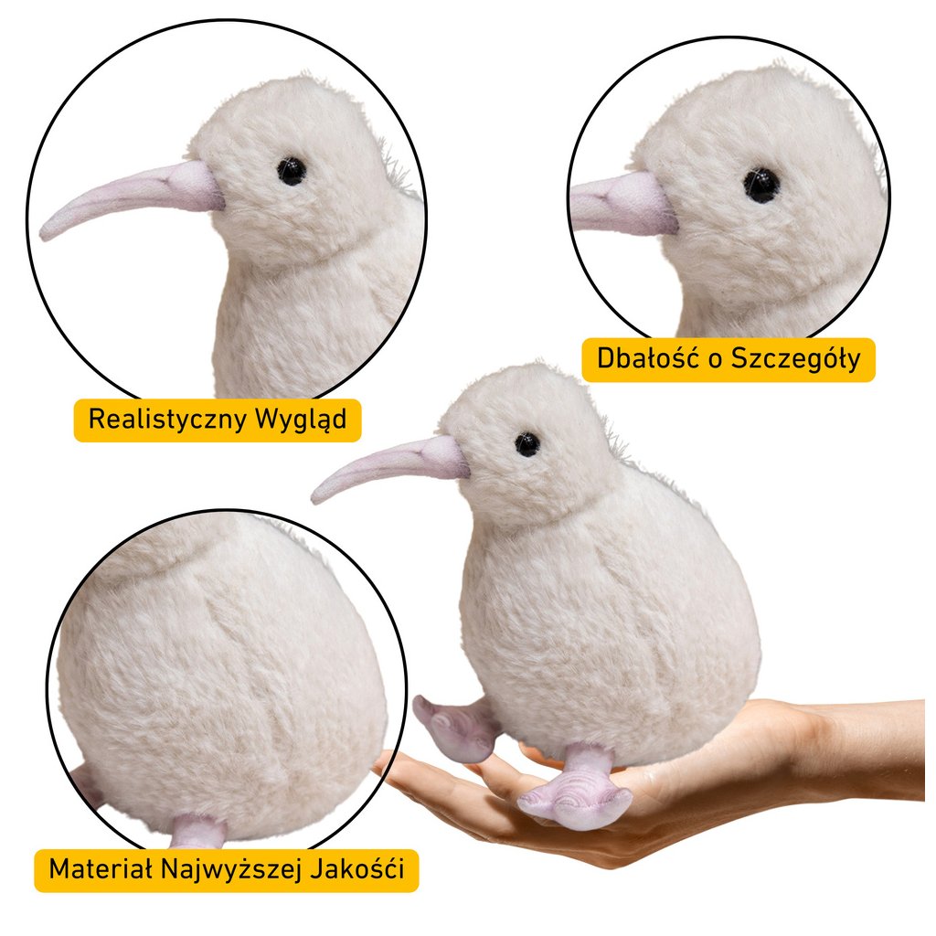 Plyšový pták kiwi o výšce 21 cm je věrnou replikou unikátního ptáka s typickým bílým peřím Vyrobený z velmi měkkého a na dotek příjemného materiálu poskytuje mimořádný komfort při objímání