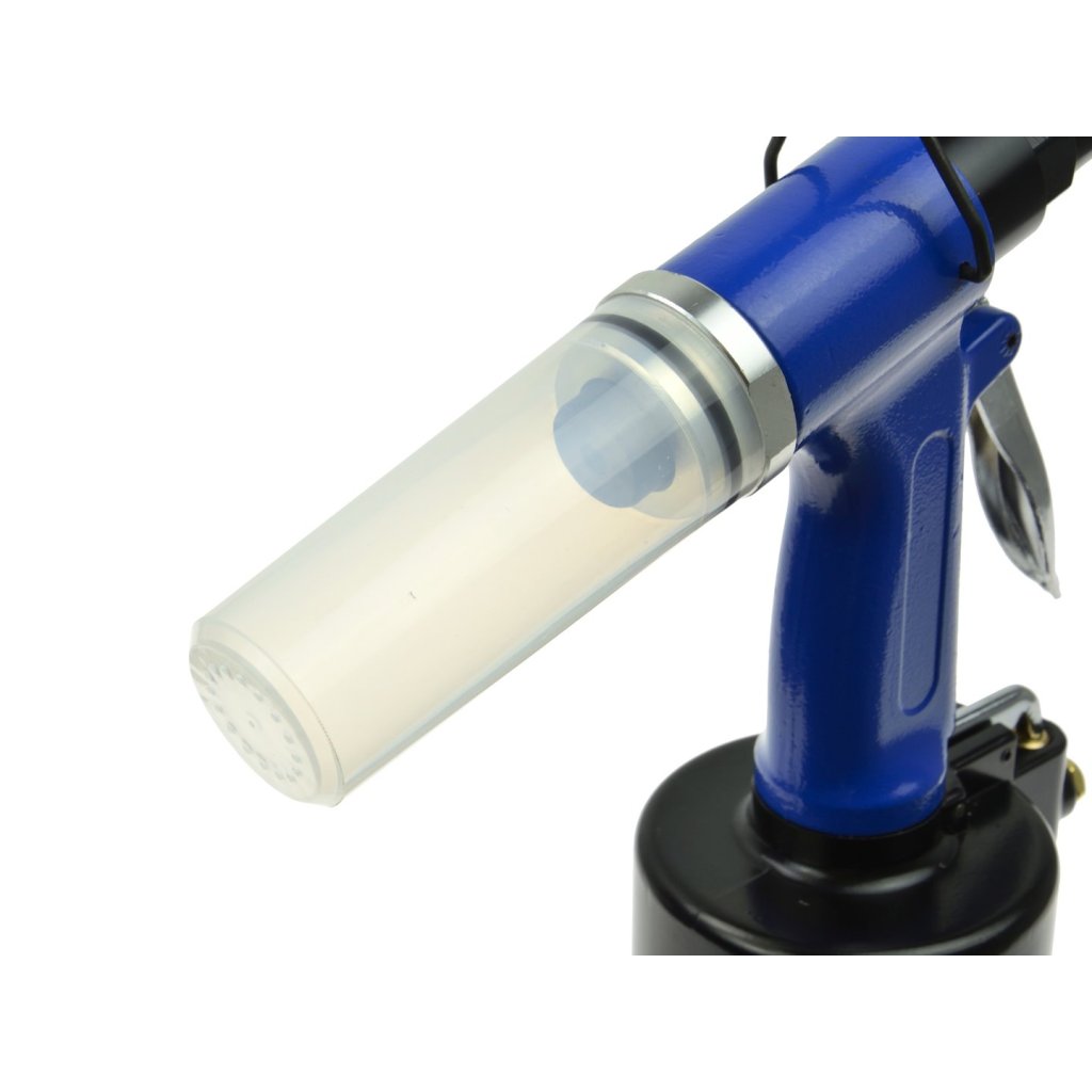 Je vybaven nádobou, do které se shromažďují odpadky vznikající při procesu nýtování.